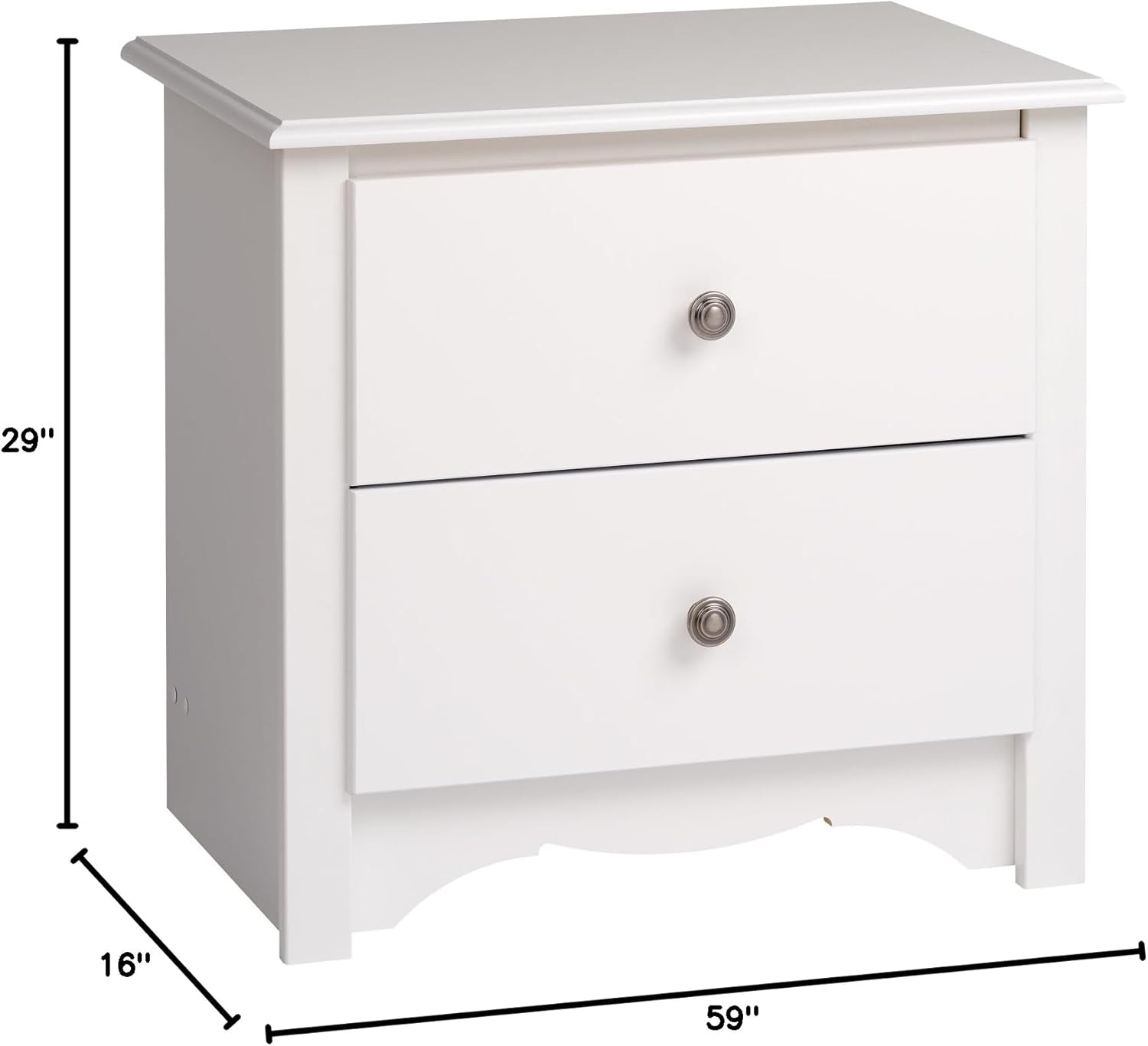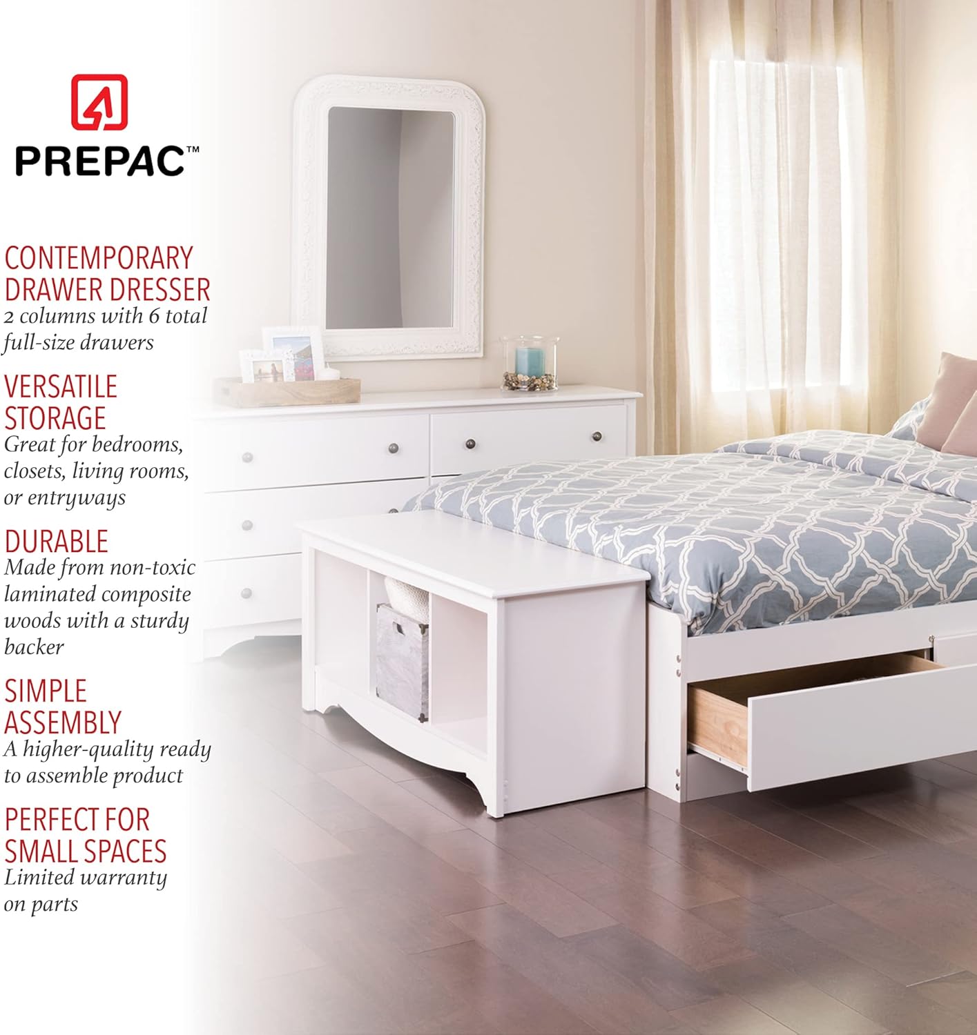 Prepac Monterey 6 Drawer Dresser, WhiteThis 6-drawer dresser features six full size drawers, a profiled top, side moldings and an arched kick plate. Other highlights include dark pewter finished solid metal knobs and drawers that run on smooth all-metal roller glides with built-in safety stops. As a higher quality Ready-to- assemble product, It is made from durable composite woods, and unlike other RTA furniture, has no plastic edge banding.Prepac Monterey 2 Drawer Nightstand, Regular, WhiteThis Night Stand features two drawers, a profiled top, side moldings and an arched kick plate. Other highlights include solid brushed nickel knobs and drawers that run on smooth, all-metal roller glides with built-in safety stops. As a higher quality ready-to-assemble product, it is made from durable composite woods. Matches other items from Prepac's Monterey collection.