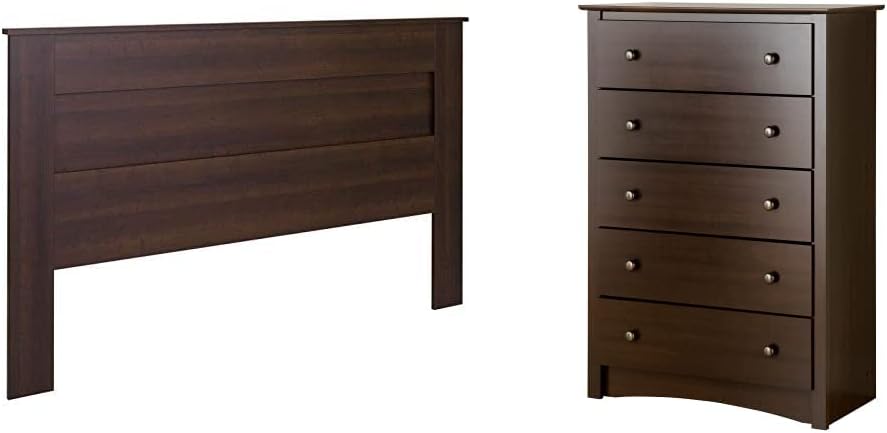 Prepac Select King Flat Panel Headboard EspressoWith its clean and simple design, the Prepac Flat Panel Headboard adds elegance to your bedroom. This headboard features softened edges and sleek lines for a stylish finish. Predrilled holes allow the headboard to easily connect to metal bedframes. Match this headboard with Prepac’s 4-Post Platform bed to complete your bedroom décor.Prepac Fremont 5 Drawer Chest, Espresso BrownIf you ; re looking for that essential bedroom chest, look no further than the Fremont 5 drawer chest. With five drawers to accommodate all your clothing, this chest stores it with Class. Have a bedroom furniture staple with storage space and good looks, all in one. Coordinate with other items in the Fremont bedroom collection for added elegance!