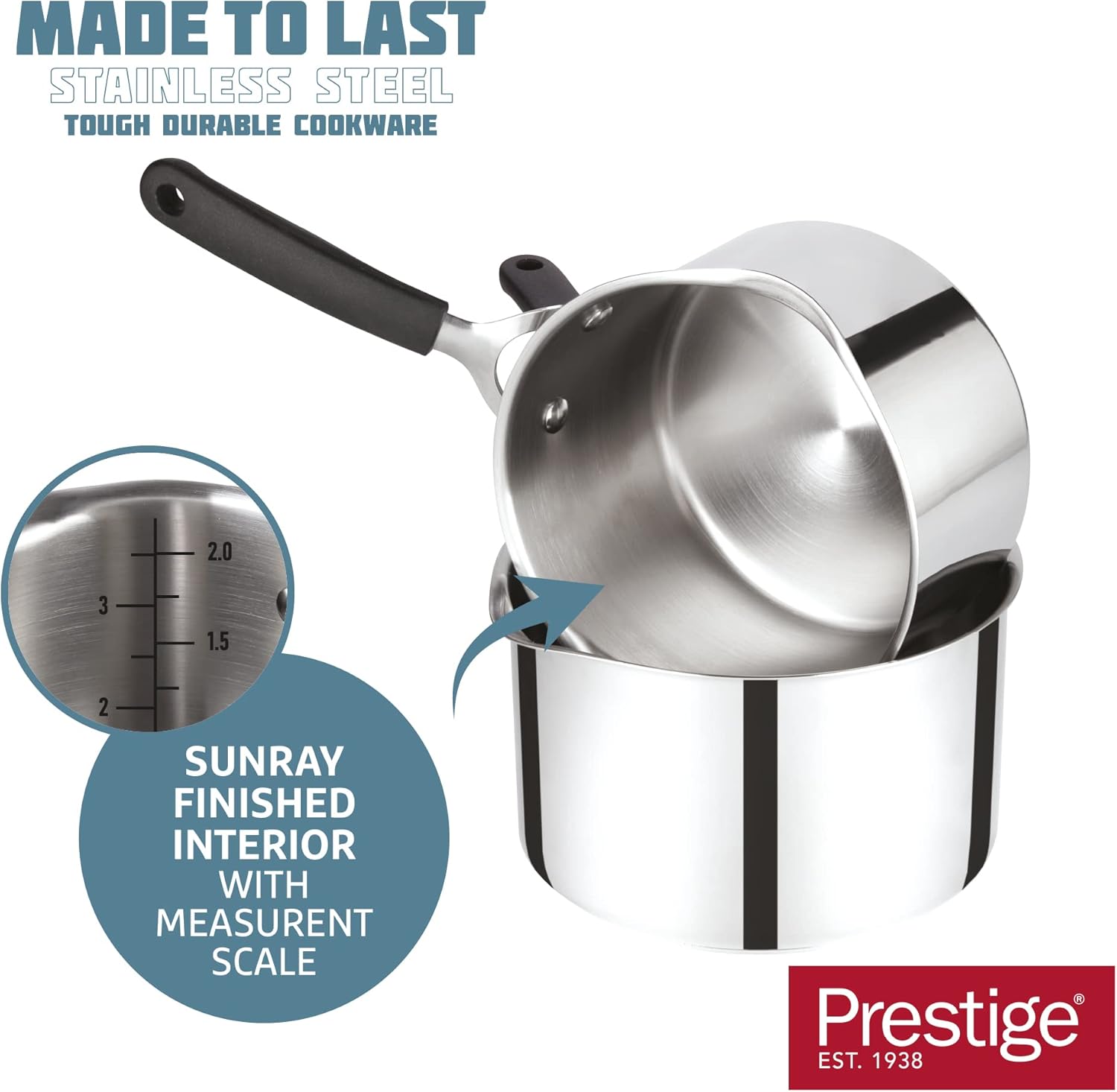 Prestige Made To Last Stainless Steel Saucepan with Lid 20cm - Large saucepan with Straining Lid, Measurement Guide & Easy Grip Silicone Handles, Induction Suitable, Dishwasher Safe Cookware