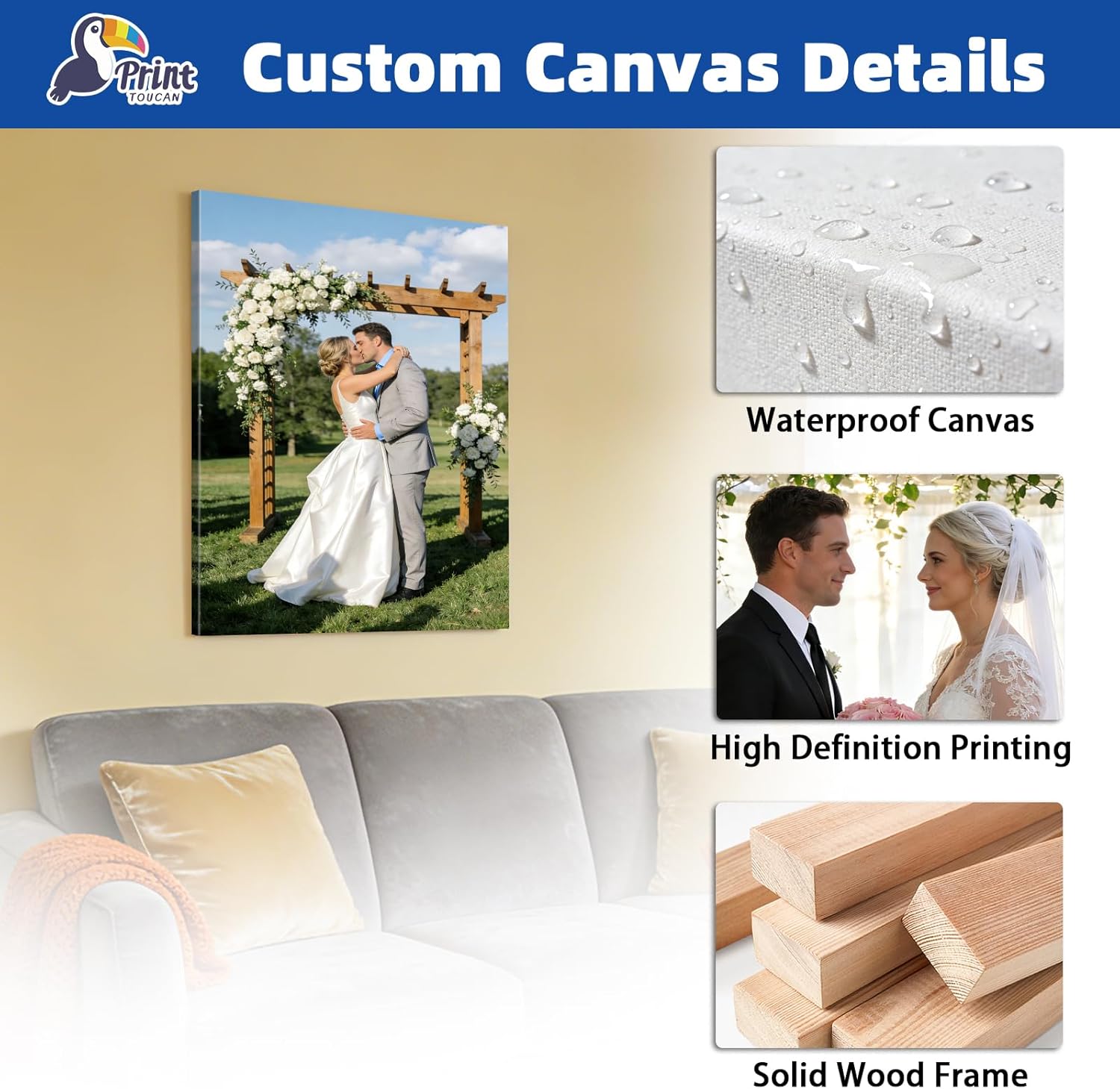 | Special Features | Easy hanging wall art for living room, bedroom, office, nursery, Business use: model homes, rentals, cafe decor, restaurant walls, salon, spa, hotel lobby, corporate office branding, Multiple size options, Personalized 12 color ink canvas, Premium thick cotton canvas, UV resistant archival inks 100 year fade resistance, Gallery wrapped edges with mirror wrap, Hand stretched in USA, Ready to hang hardware, Tear and water resistant coating, Perfect for graduation, wedding, couple memories |