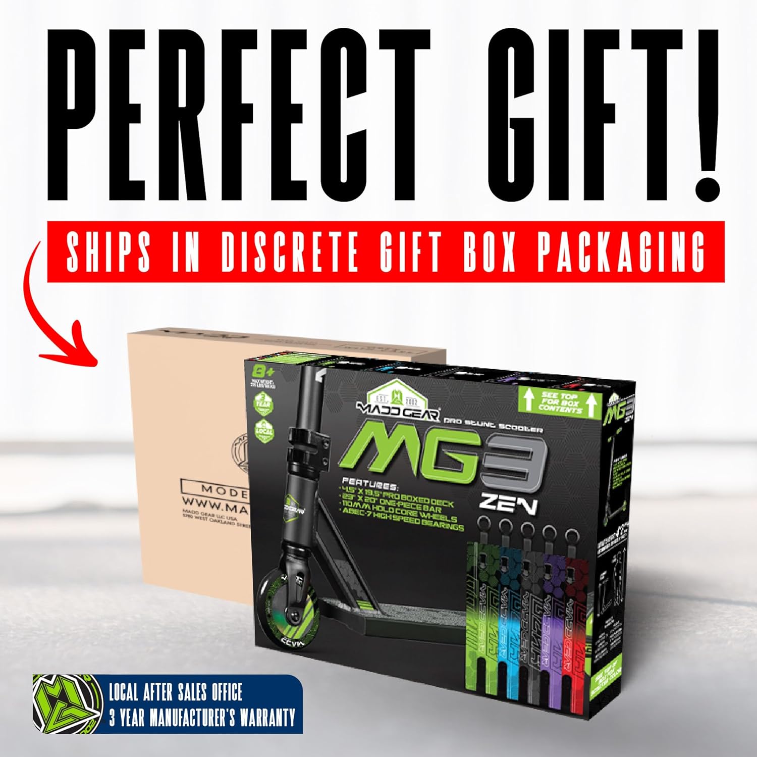 The Madd Gear MG3 Pro Trick Scooter is designed for kids ages 8-12 ready to build confidence and master beginner tricks at the skate park or on the street. This lightweight 2 wheel stunt scooter features a durable extruded aluminum deck and a strong one-piece steel T-bar for lasting strength and control. With larger 110mm polyurethane wheels and ABEC-7 precision bearings, it delivers a fast, smooth, and stable ride over ramps, sidewalks, and parks. Perfect for learning barspins, tail whips, and more. Assembly is easy — slide on the handlebars and tighten the clamp with the included tool; your freestyle scooter is ready to roll in minutes. Backed by 20+ years of action sports innovation, a 3-year manufacturer’s warranty, and trusted Madd Gear quality. Recommended Rider Age: 8-12 years Recommended Rider Weight: Up to 220 lbs (100 kg)