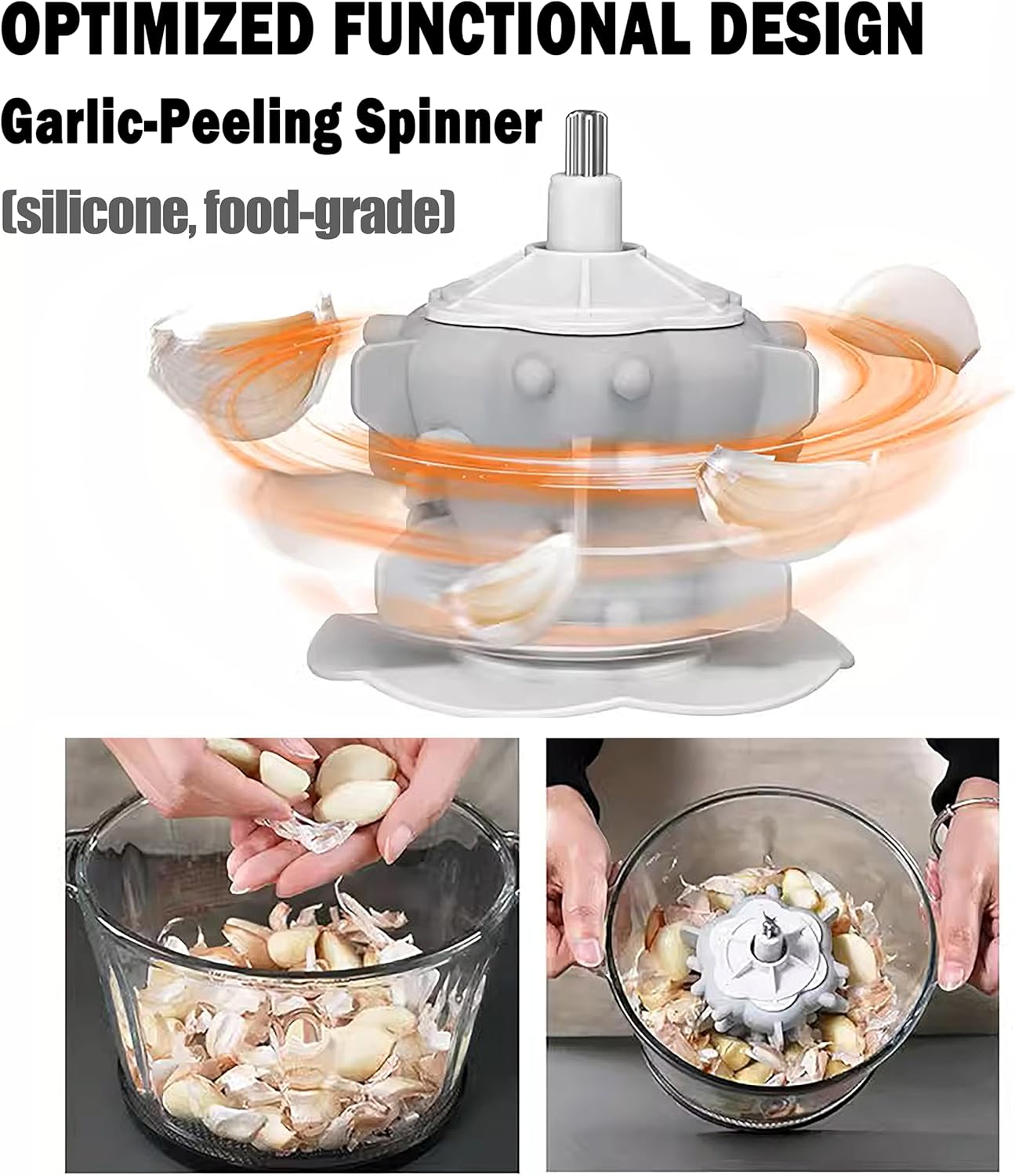 Introducing GARLICLY Professional Electric Garlic Peeler, your ultimate kitchen time-saver. This powerful 300W automatic machine swiftly and efficiently peels garlic with its dual-speed modes, handling large quantities up to 2.2L in its spacious container. 1 Beyond effortless garlic peeling, the GARLICLY cleverly converts into a versatile food processor with the included blade, allowing you to quickly chop vegetables, nuts, and more, making it a truly indispensable and efficient tool for any home or professional chef.