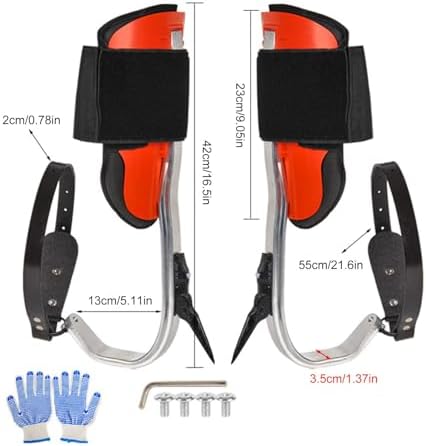 Experience the excitement of tree climbing with our Non-Slip Tree Climbing Shoes, expertly designed for both enthusiasts and professionals seeking comfort and safety. Made from lightweight aluminum alloy, these climbing spikes feature a durable 40# steel tip that ensures stability as you ascend. The PVC legs enhance grip, allowing you to tackle gardening tasks with confidence, whether you’re pruning high branches, harvesting fruits, or enjoying nature. Our Tree Climbing Spikes are engineered to reduce fatigue, making your gardening and tree maintenance more enjoyable. Each pair offers a comfortable fit with a foot width of approximately 3.5cm, accommodating various foot sizes without compromising support. Your purchase includes everything you need to get started: one pair of Tree Climbing Spikes, a pair of gloves for added protection, a hexagonal wrench for easy adjustments, and screws for secure fitting. This complete package ensures you are well-equipped for any climbing task. Please note that colors may vary slightly due to different monitor settings, and minor measurement deviations may occur. Elevate your outdoor adventures with our Tree Climbing Spikes and embrace your climbing journey with confidence!