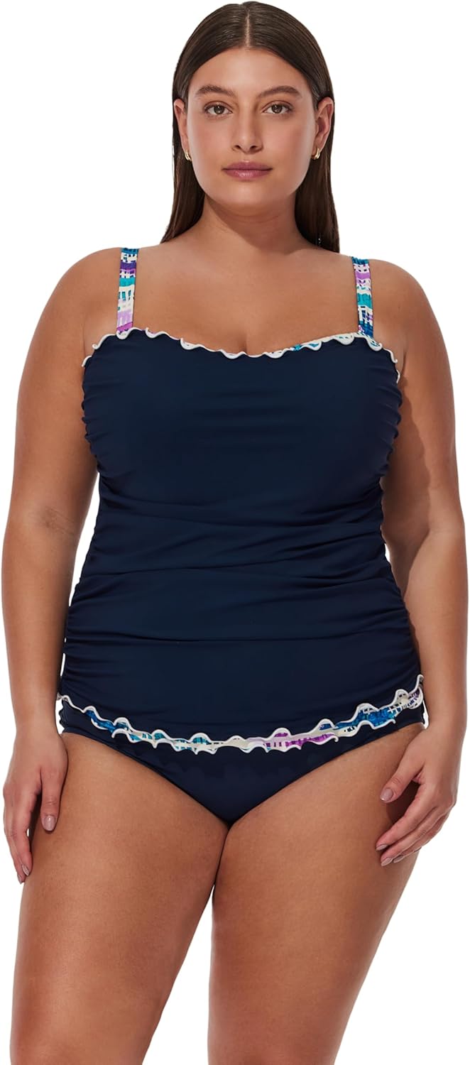 Feel confident and playful in the Canva Plus Size Shirred Underwire Tankini Top, featuring a charming navy and purple paint-wash pattern with subtle shirred detailing. The built-in underwire foam cup bra provides shaping and support, while adjustable straps allow you to customize your fit. Front lining ensures comfort and coverage, and it pairs perfectly with the Canva Skirted Bottom or any of our Tutti Frutti bottoms for a coordinated swim look. Profile by Gottex was launched in 2006 and quickly became a major volume swimwear resource for retailers worldwide. Profile has evolved as one of the best looking and fitting swim brands in the market. Using top quality fabrications often found in brands twice as expensive and construction elements unparalleled in swimwear, the result is a suit that looks like a strong fashion statement despite the highly technical fitted garment that is Profile’s true nature. Offering a great breadth of silhouettes with varied levels of coverage, support and sizing in smart, on trend colors and prints, every woman is given an option to create her own look that fits! This customer has many moods from fun and flirty to sophisticated and demure, but always feminine and modern at her core.