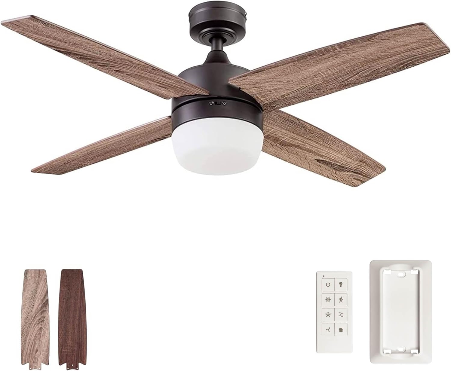 The Prominence Home Atlas has a unique, modern appeal and adds a splash of glamour and elegance to your contemporary spaces. The dazzling Champagne body adds a splash of color bringing the eye upwards and making your space look bigger and brighter! This 44-inch ceiling fan is sculpted with rounded edges perfectly balanced by high contrasting blade angles. Its sleek cylindrical body houses a powerful, integrated dimmable LED light adding simplicity to style. The Atlas was expertly designed with four clean-lined, reversible blades with a different finish on each side. One side comes with a white finish, while the other side features a honey oak finish- Adjusting the blades is easy and the choice is yours!The robust motor and design provides adjustable, reversible air movement that is ultra-efficient whether you want to cool down on those sweltering summer days or circulate warm air in the cold months of winter.The included remote controls the power, 3 speed settings of the fan, the reversible airflow and light for the ultimate convenience. To ensure your long-term satisfaction, this fan is backed by a limited lifetime warranty. The Prominence Home Atlas gives you all the quality functions you deserve while providing the impressive eye-catching style you crave.
