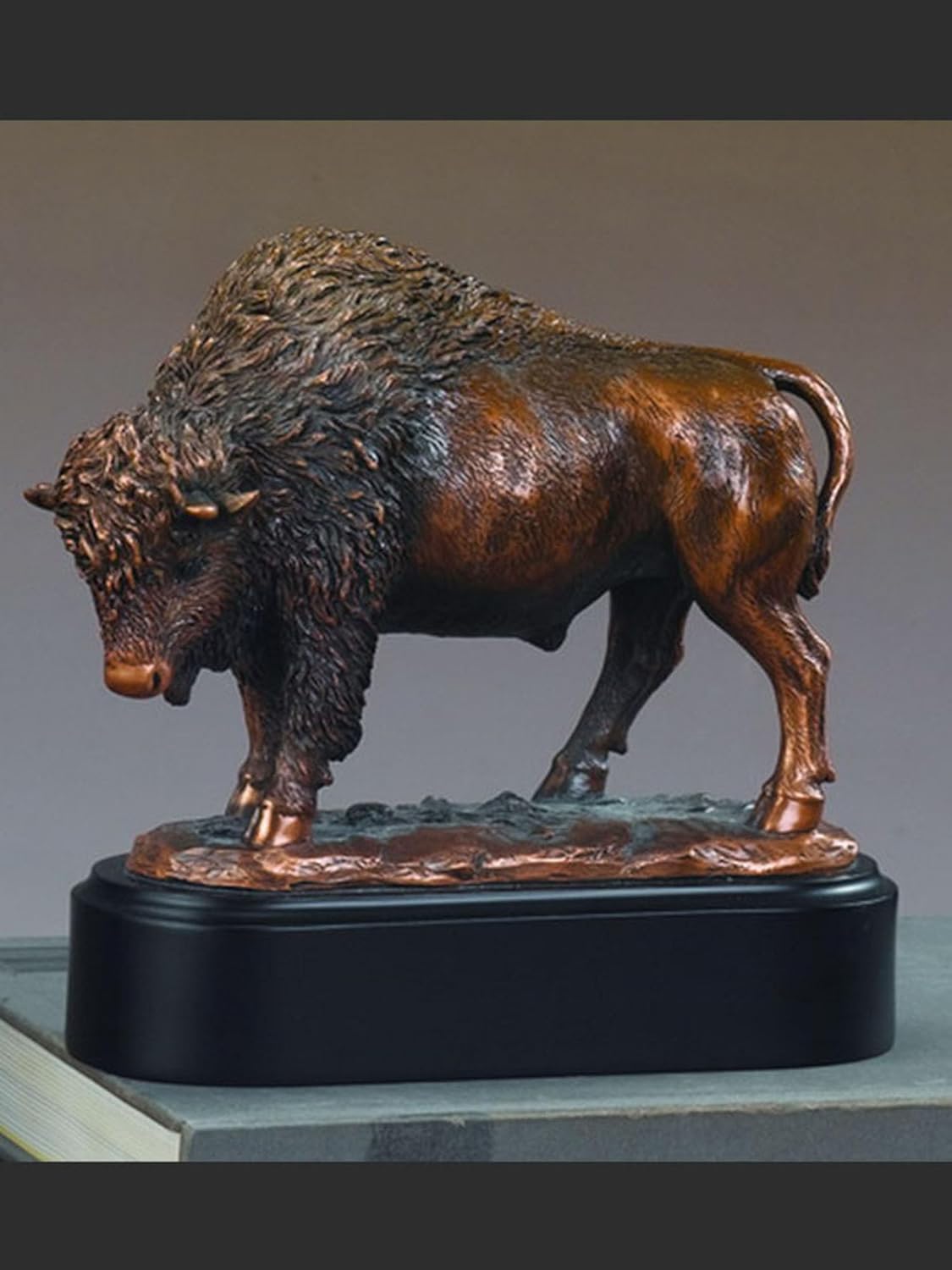 Proud and rugged, this buffalo statue makes for a great desk topper. 7"Wx7"H Buffalo These sculptures are made using a bronze electro-plating process. The result is a fine sculpture with great detail and high quality for less than half the price of solid bronze.