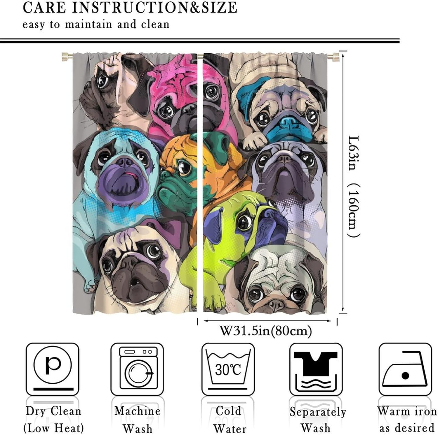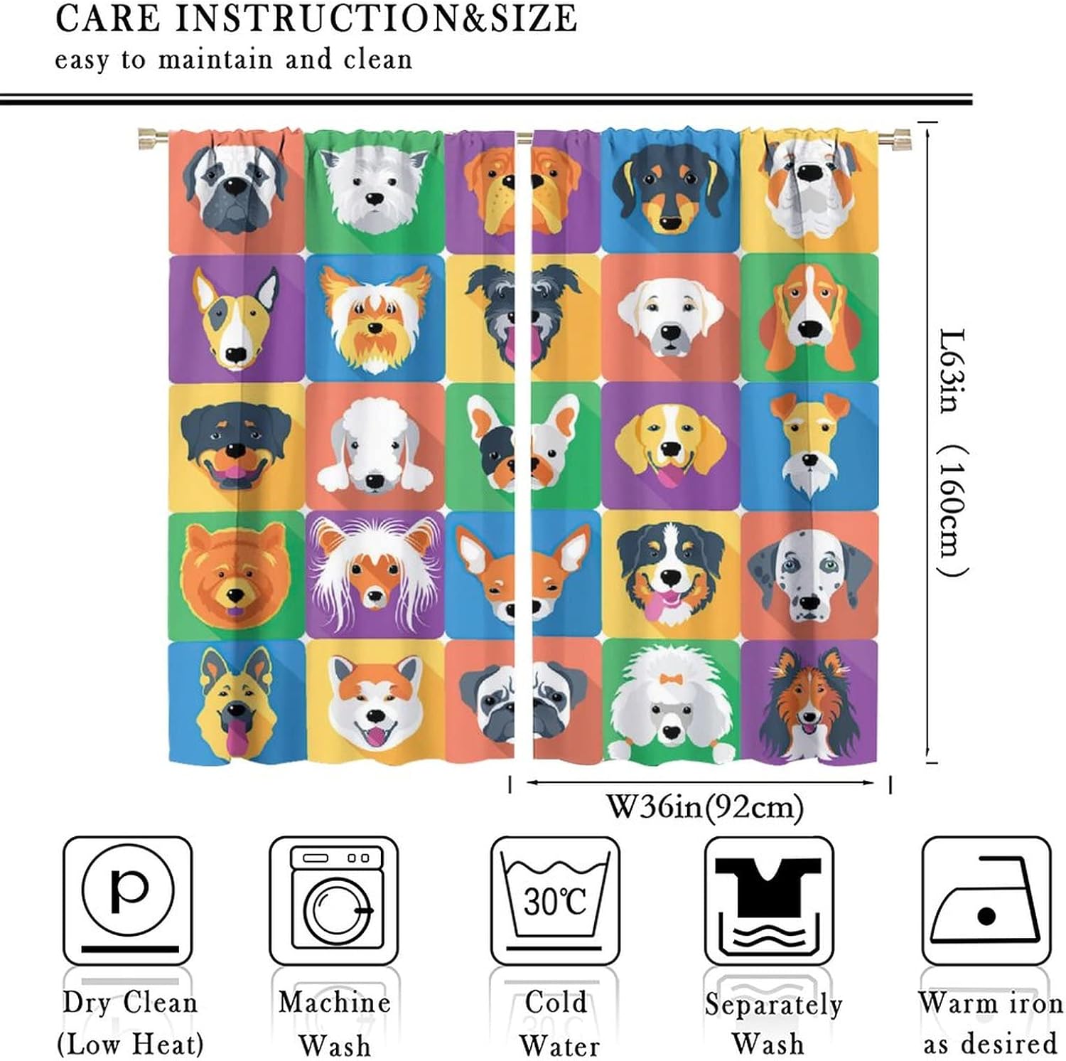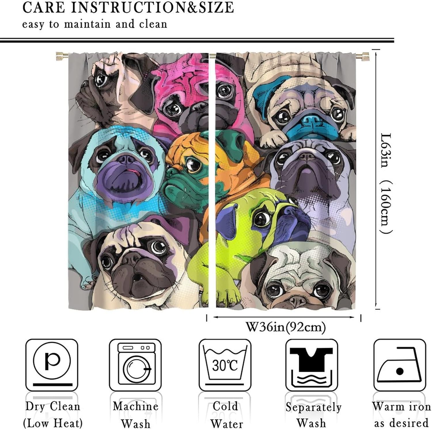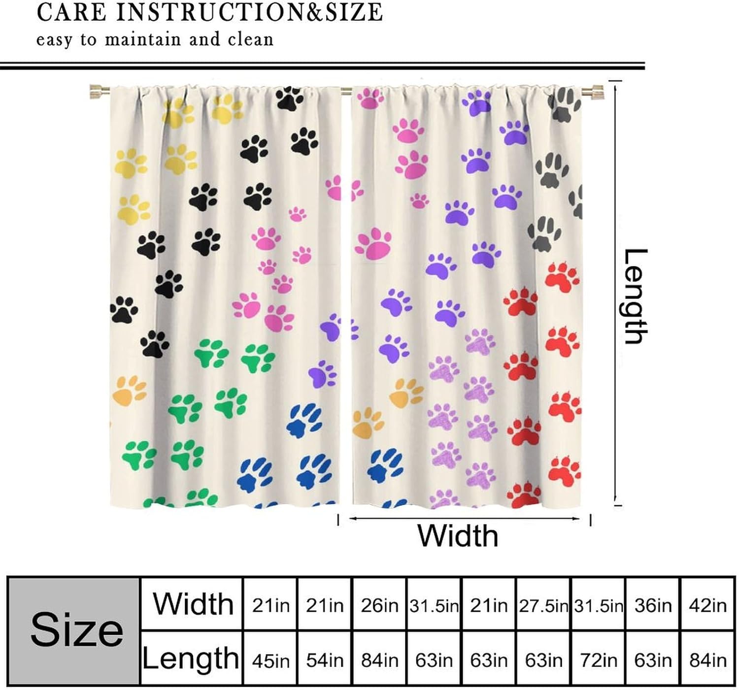 Package included:2 panels per package.Size:One panel measures 21" (W) x 45" (L). The overall size is 42"(W) x 45"(L).One panel piece measures 21" (W) x 54" (L). The overall size is 42"(W) x 54"(L).One panel piece measures 21" (W) x 63" (L). The overall size is 42"(W) x 63"(L).One panel piece measures 27.5" (W) x 63" (L). The overall size is 55" ( W ) x 63" ( L ).One panel piece measures 26" (W) x 84" (L). The overall size is 52" (W) x 84" (L).One panel piece measures 31.5" (W) x 63" (L). The overall size is 63" (W) x 63" (L).One panel piece measures 36" (W) x 63" (L). The overall size is 72" (W) x 63" (L).One panel piece measures 31.5" (W) x 72" (L). The overall size is 63" (w) x 72" (L).One panel piece measures 42" (W) x 84" (L). , The overall size is 84" (W) x 84" (L).About the material:1. Made of fiber polyester fabric.2. High color fastness, no fading even after long term use.3. No chemical coating, no odor, healthier and safer for people, especially for babies and children.About the function.1. It can block out 70%-90% of light and can protect privacy by blocking light or darkening the room.2. It is very suitable for bedroom, living room, kitchen, cafe, office, closet, door, bathroom, dining room, dormitory, nursery, outdoor patio, etc.3. It is also one of the best gifts for family, friends, relatives or yourself.Warm tips:1. Machine washable in cold water.2. The pattern is only on one side, the other side is white.3. Due to manual measurement, please allow 1-2 cm difference.Our service:We focus on 100% customer satisfaction. If you have any questions or problems, please contact us by email, we will reply within 24 hours and provide a satisfactory solution.