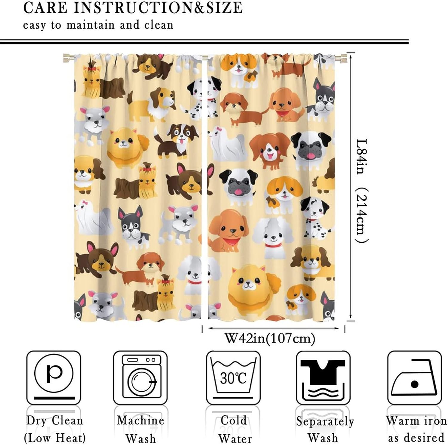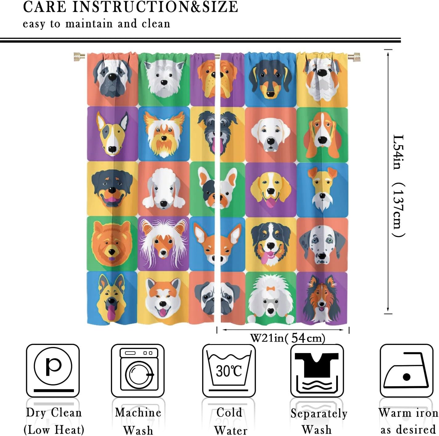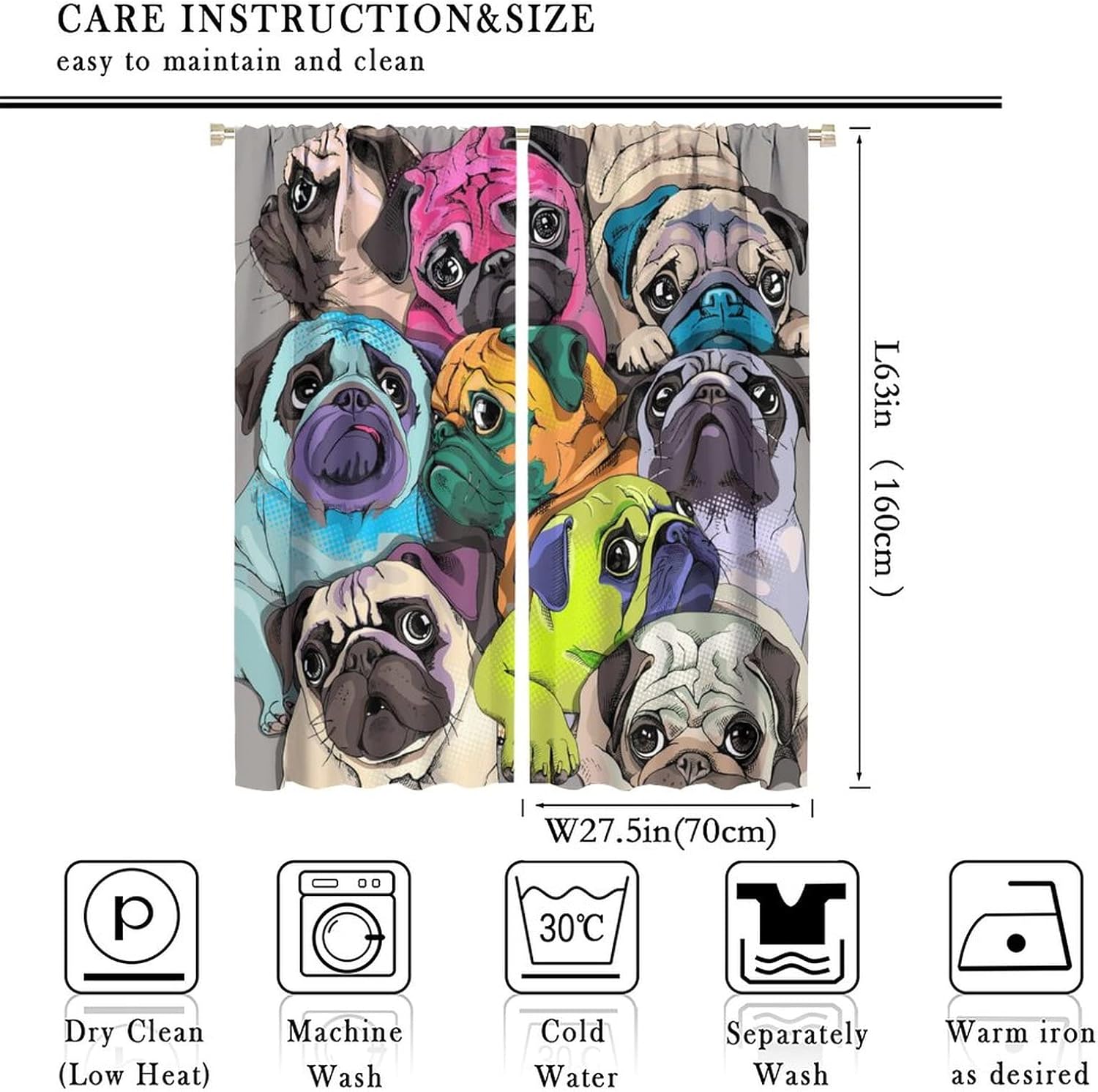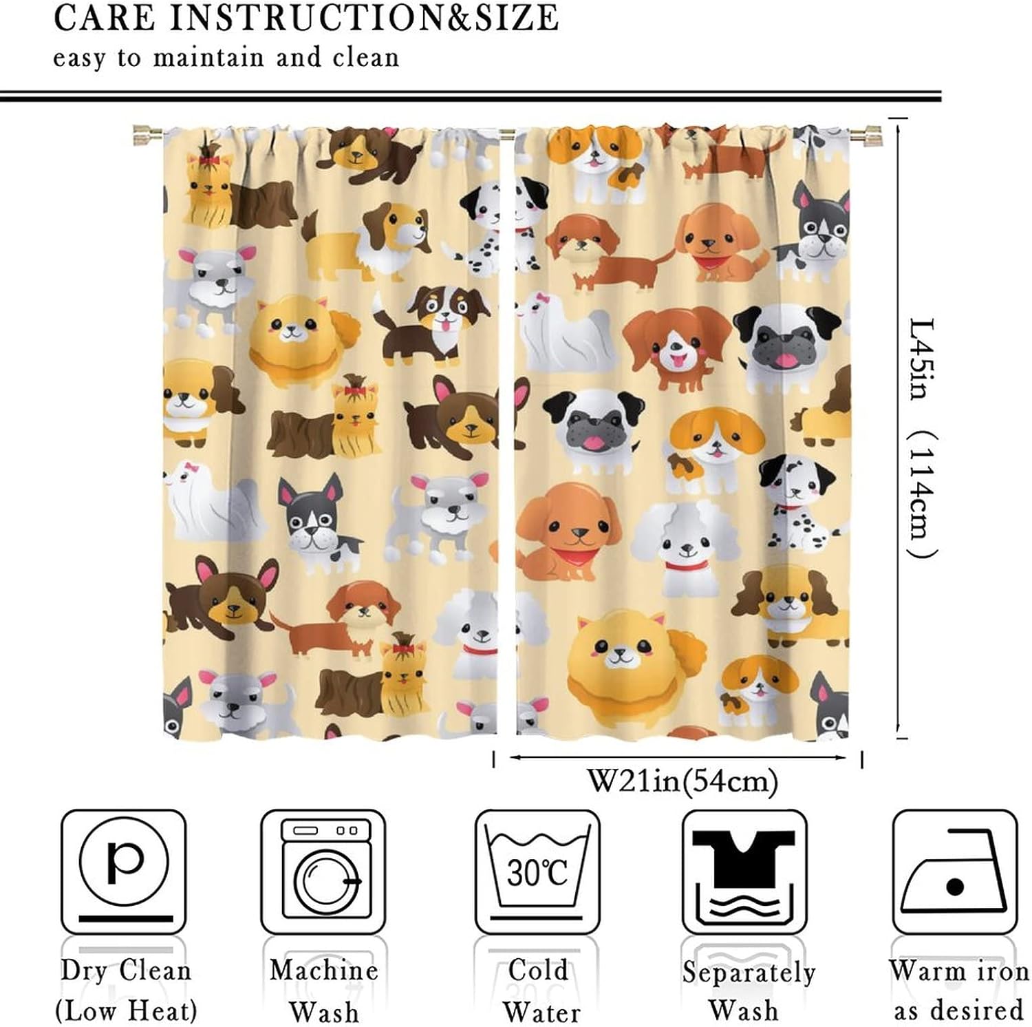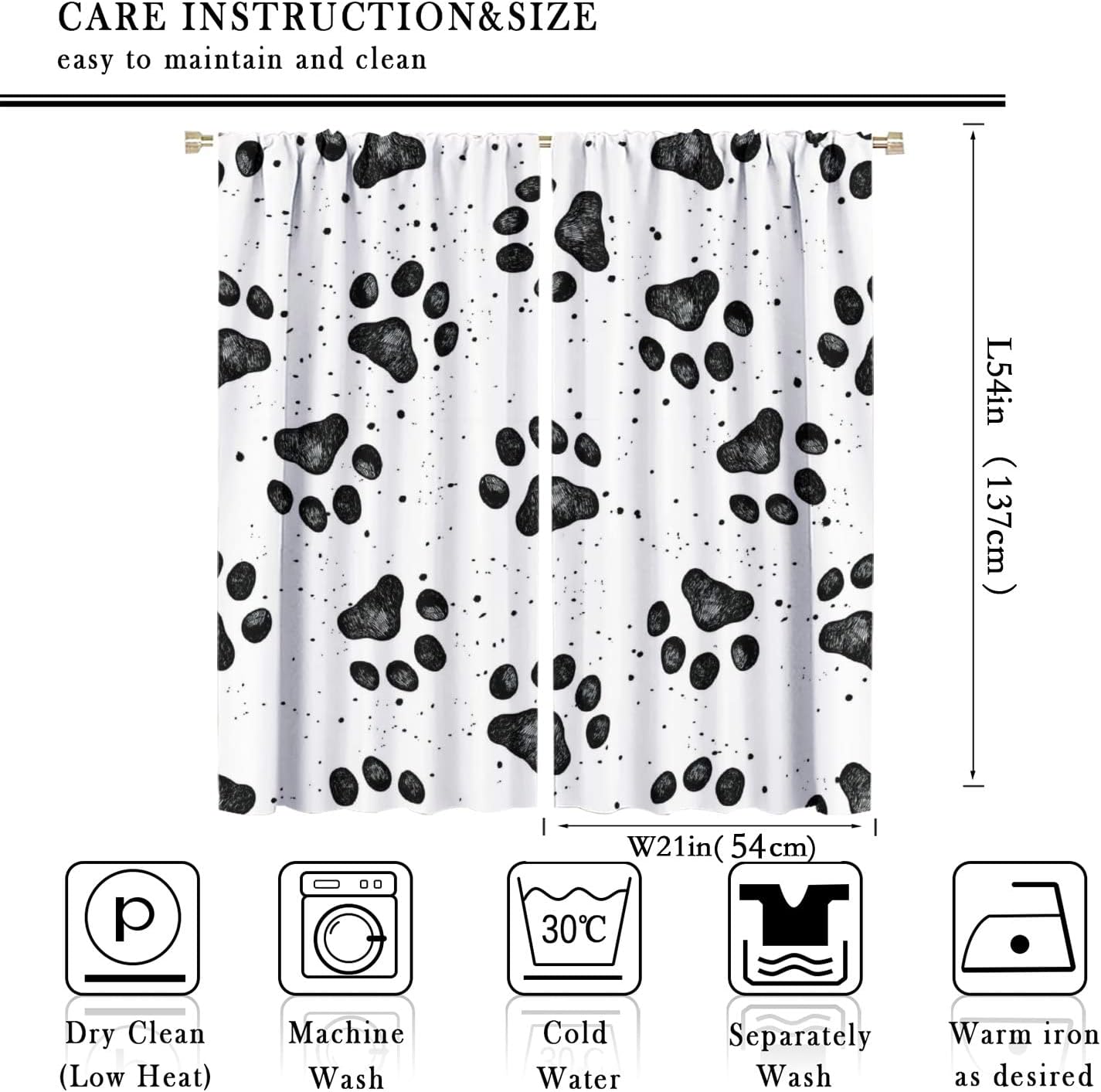 Package included:2 panels per package.Size:One panel measures 21" (W) x 45" (L). The overall size is 42"(W) x 45"(L).One panel piece measures 21" (W) x 54" (L). The overall size is 42"(W) x 54"(L).One panel piece measures 21" (W) x 63" (L). The overall size is 42"(W) x 63"(L).One panel piece measures 27.5" (W) x 63" (L). The overall size is 55" ( W ) x 63" ( L ).One panel piece measures 26" (W) x 84" (L). The overall size is 52" (W) x 84" (L).One panel piece measures 31.5" (W) x 63" (L). The overall size is 63" (W) x 63" (L).One panel piece measures 36" (W) x 63" (L). The overall size is 72" (W) x 63" (L).One panel piece measures 31.5" (W) x 72" (L). The overall size is 63" (w) x 72" (L).One panel piece measures 42" (W) x 84" (L). , The overall size is 84" (W) x 84" (L).About the material:1. Made of fiber polyester fabric.2. High color fastness, no fading even after long term use.3. No chemical coating, no odor, healthier and safer for people, especially for babies and children.About the function.1. It can block out 70%-90% of light and can protect privacy by blocking light or darkening the room.2. It is very suitable for bedroom, living room, kitchen, cafe, office, closet, door, bathroom, dining room, dormitory, nursery, outdoor patio, etc.3. It is also one of the best gifts for family, friends, relatives or yourself.Warm tips:1. Machine washable in cold water.2. The pattern is only on one side, the other side is white.3. Due to manual measurement, please allow 1-2 cm difference.Our service:We focus on 100% customer satisfaction. If you have any questions or problems, please contact us by email, we will reply within 24 hours and provide a satisfactory solution.