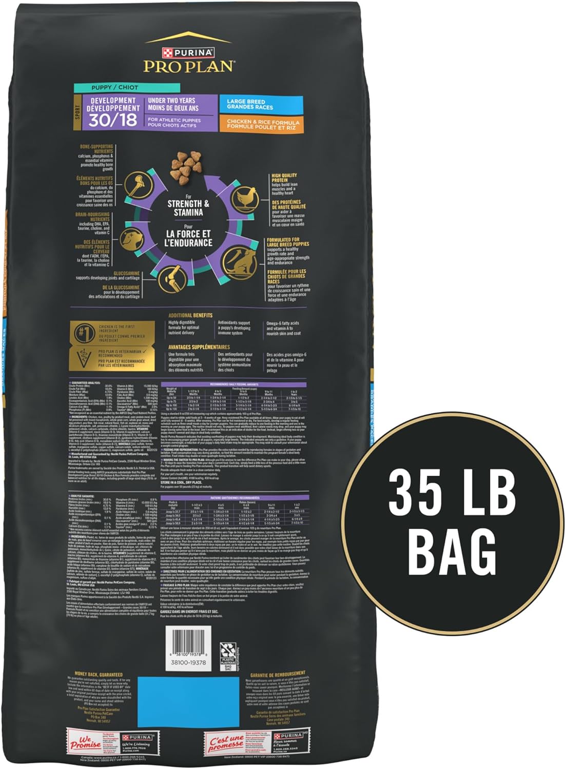 Provide your large breed puppy with fine-tuned nutrition for a healthy growth rate, plus age-appropriate strength and endurance with Pro Plan Sport Large Breed Puppy Development 30/18 Chicken and Rice high protein dog food for puppies. This Purina large breed puppy food is formulated for athletic large breed puppies. It promotes concentration, problem solving and trainability for excellence in the field, the show ring, and at home. Nutrients like calcium, phosphorus and essential vitamins promote healthy bone growth. Plus, this kibble dog food features real chicken as the #1 ingredient and high-quality protein for lean muscle and heart health. It’s also formulated with antioxidants for dogs to support your puppy’s developing immune system. Be confident in the quality and safety of the dog food kibble in every Purina Pro Plan formula, including Purina Sport dog food, because they’re proudly manufactured in Purina-owned U.S. facilities. Try this Purina large puppy food today, risk-free.