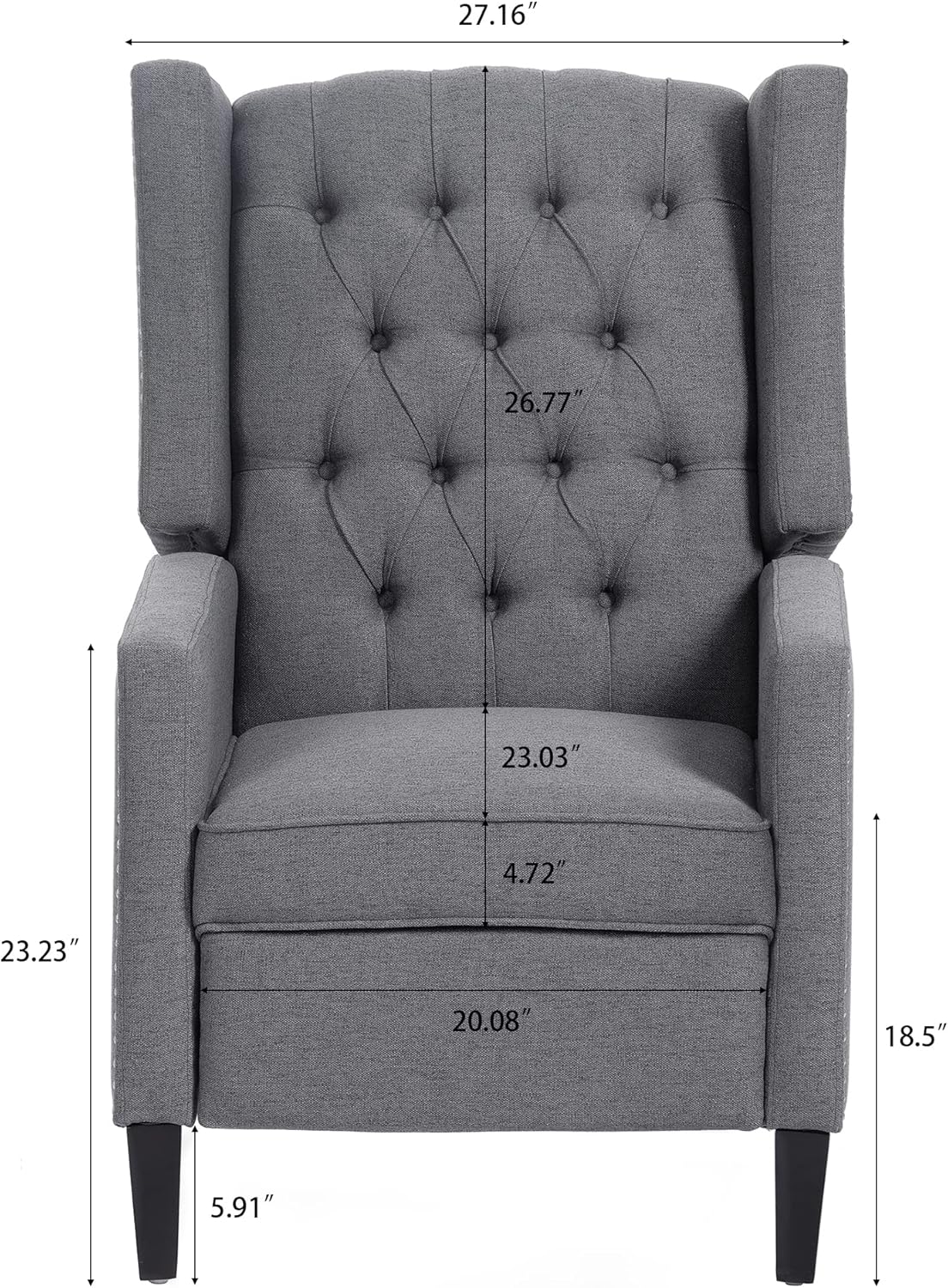 Wingback Recliner Chair,Push Back Recliner Sofa,Tufted Linen Fabric Single Sofa Accent Armchair Sitted in this comy armchair,you will have a moment of inner peace and relief,relaxing your body and enjoying yourself. The recliner will make a statement in any room of your home for entertaining or relaxing this recliner will offer an intelligent design touch to your living spaces. 【Features】 ▪Rivets trim decorative chairs exquisite workmanship with durable polyester upholstery with diamond-stitched button tufting,completing the traditional charm of this eye-catching accent living room chairs. ▪You can sit or lie on this recliner in almost any way.the legs of this recliner can be stretched out and the angle of the back can also be adjusted(90-135 Degree),Easily push back to activate the reclining mechanism and fall into a cradle of comfort. ▪The shape and height of the back command attention with high resilience foam,while the armrests and Padded cushion seat allow for reclining,at this moment,you can forget your troubles and feel the comfort brought by the recliner wholeheartedly. ▪Versatile convertible design allows you to put it anywhere you like living room,bedroom,home theater.you can reading,getting rid of your phone,then notice the beauty than may never found before. ▪The frame of this singlr sofa chair are engineered from solid hardwood to provide added stability and durability.weight of 330 lbs. 【Weight & Dimensions】 ▪Overall Dimension:24"D x26"W x 36.2"H ▪Weight Capacity:330 lbs ▪Fabric Material:Linen