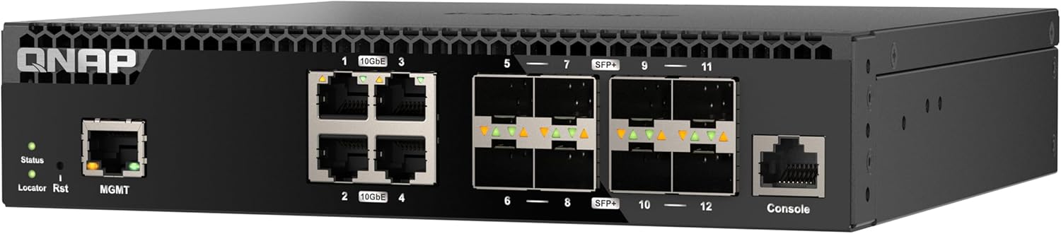 The QSW-M3212R-8S4T is a half-width rackmount managed switch with eight 10GbE SFP+ ports and four 10GbE RJ45 ports, providing SMB and SOHO users with additional ports for connecting 10GbE devices with different interfaces at an affordable price. Supporting Layer 2 switching and network management via a user-friendly web user interface, the QSW-M3212R-8S4T offers flexible deployment in high-speed network environments and provides an entry-level network management solution. With a half-width design, the QSW-M3212R-8S4T can be conveniently placed within working environments without taking up too much space, and two can be installed in a single 1U rack space. The QSW-M3212R-8S4T is Made in Taiwan (MIT), providing a high-quality and reliable networking solution.