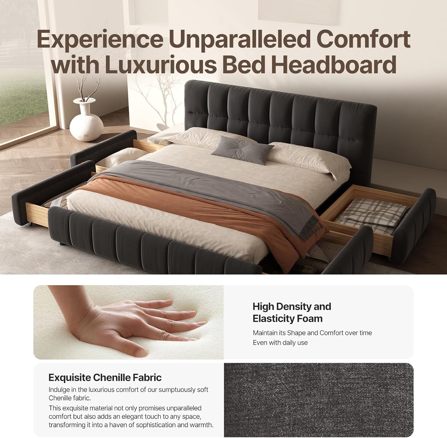 | Headboard Material | Chenille Fabric (Upholstery) over Wood |