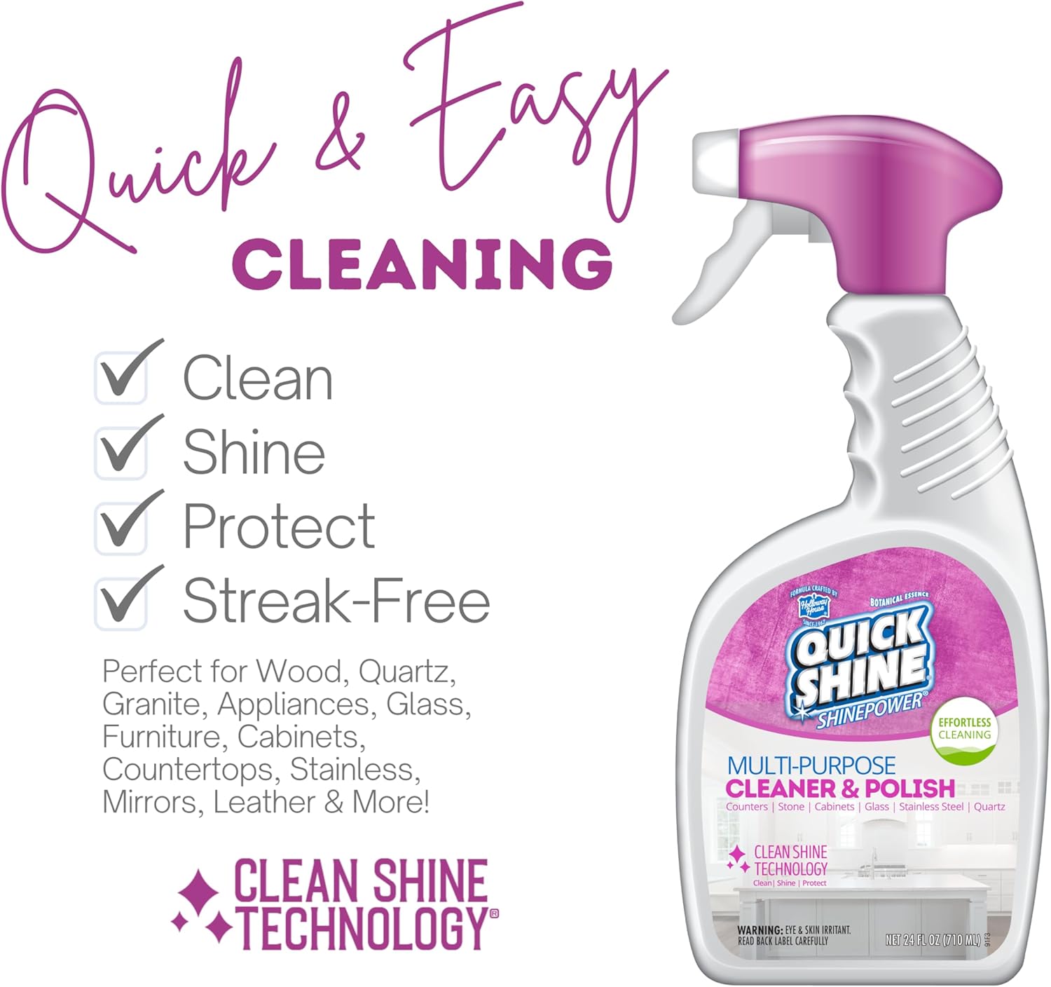 Simplify your cleaning routine with the Quick Shine 3-IN-1 MAX SHINEPOWER Surface Cleaner. It is formulated so you can quickly clean from room to room - kitchen, bathroom, dining room, entryway and more. Quick Shine 3-IN-1 MAX SHINEPOWER, 24 oz-6PK, is crafted for quick & easy living to instantly clean, shine and protect all non-porous surfaces with Clean Shine Technology. It can be used on wood, quartz, granite, stainless steel, glass, furniture, cabinets, countertops, mirrors, auto interiors, leather and more. Quick Shine SHINEPOWER will leave all your surfaces streak free with zero residue.