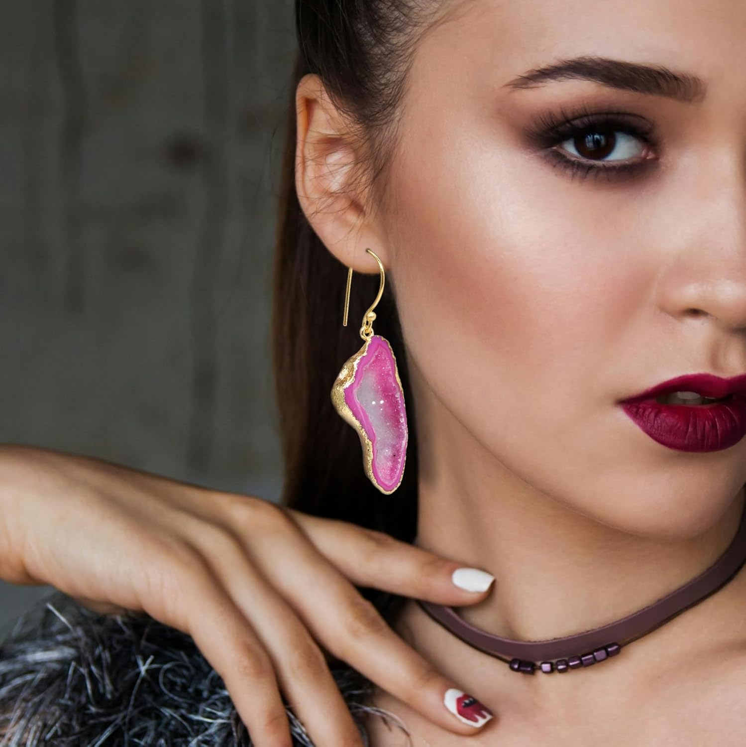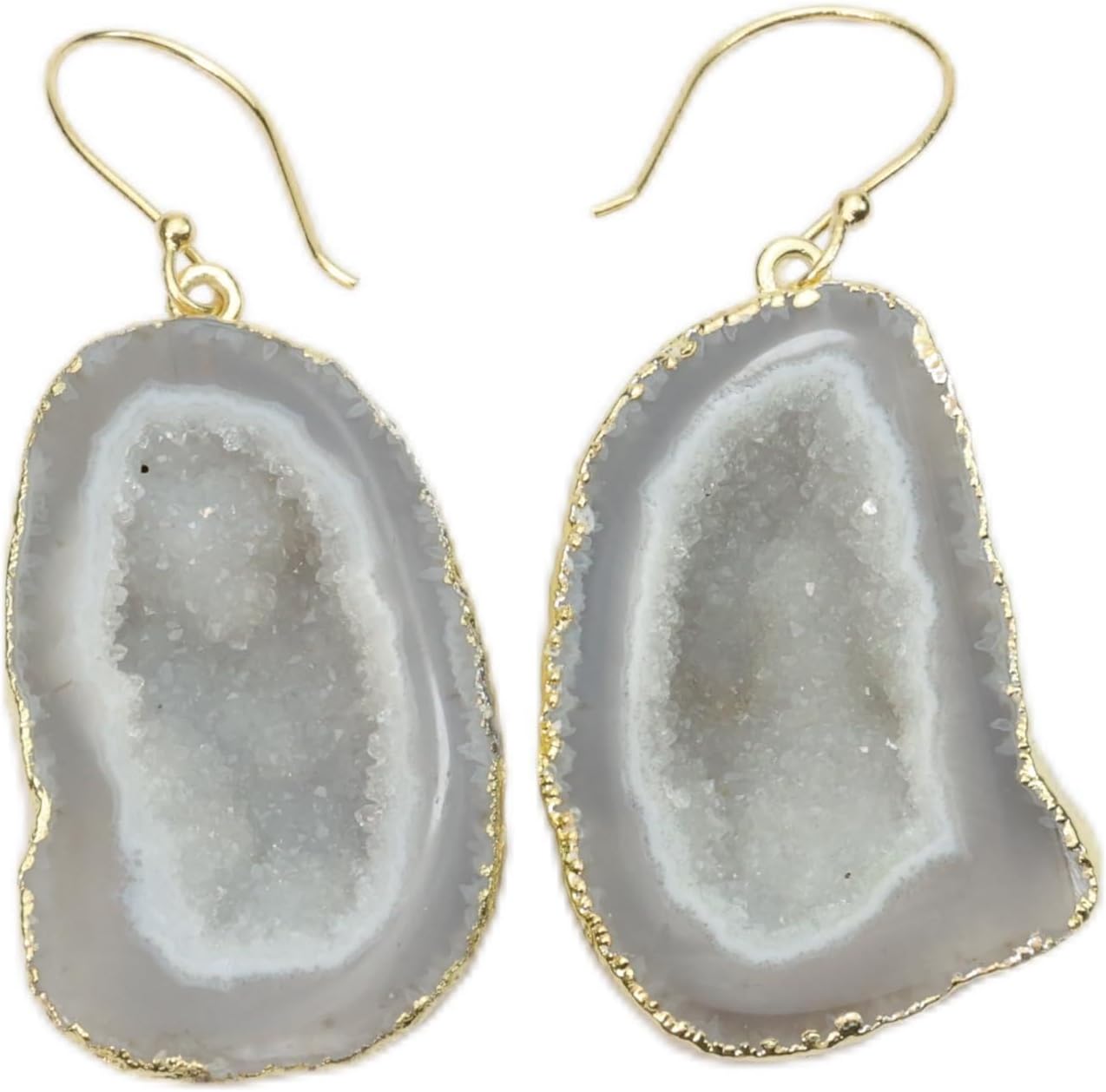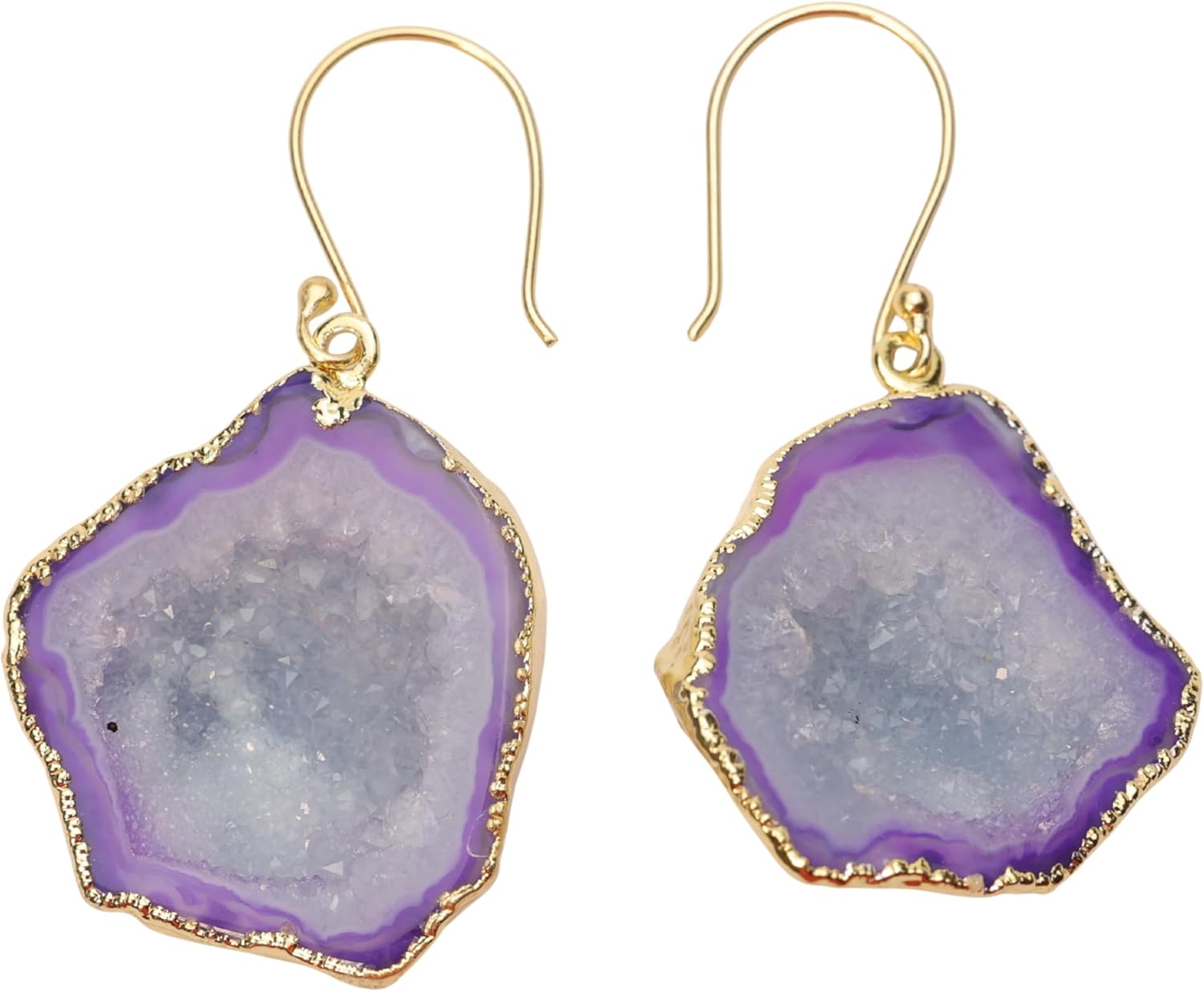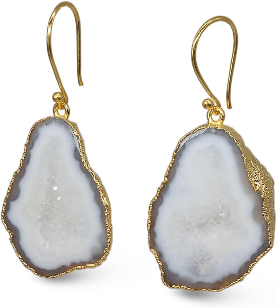 Add a splash of vibrant elegance to your style with these stunning Agate Geode Durzy Earrings. Handcrafted from genuine agate geodes, each piece features dazzling druzy crystal centers and rich blue banding that mimics the colors of the ocean. The raw, organic shape of the stones is beautifully accentuated by gold electroplated edges and matching ear hooks, creating a refined yet earthy aesthetic. Perfect for free-spirited souls and gemstone lovers, these earrings make a bold statement while remaining lightweight and wearable. A unique piece of nature, handcrafted into jewelry that’s as special as you are.
