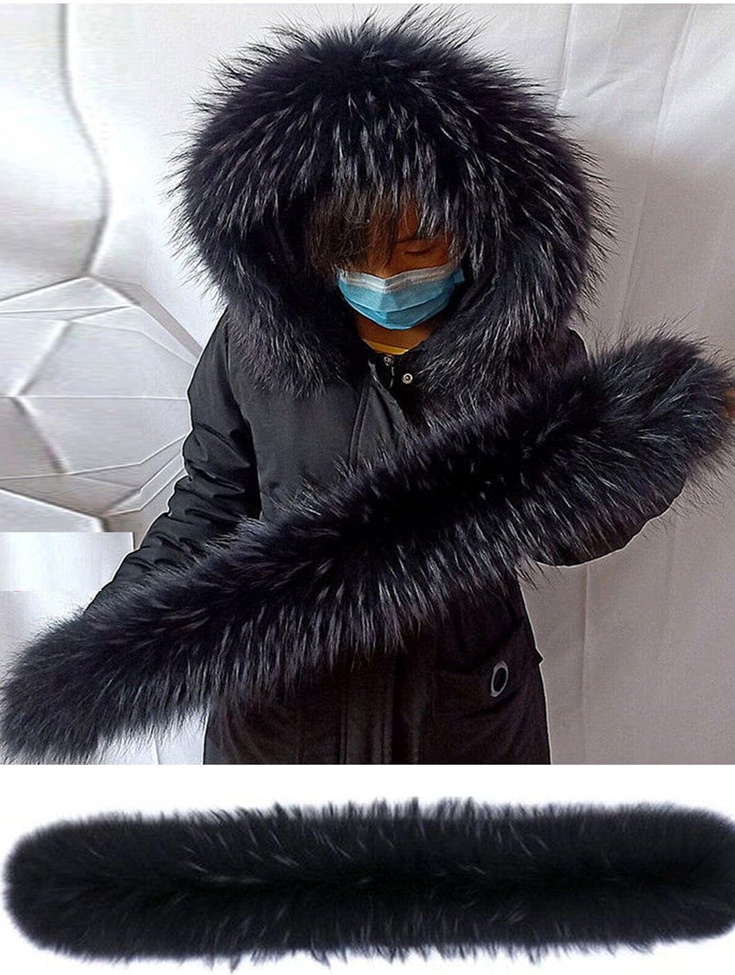 Ladies men's winter cold-proof accessories, real raccoon leather. The Hairs hoodie trim. Add luxury to your down jackets and coats, and add elegance to your clothing. The Hairs is full and hairy. It feels super soft, smooth and delicate. elegant. It is easy to match with clothes. Scenario: Effectively resist frost in winter and keep warm and noble. Perfectly matched with down jackets and jackets, home, office, shopping and travel can make you fashionable. Suitable for most men and women. Size: Length 60CM 65CM 70CM 75CM 80CM Width 16CM 18CM 20CM , 1CM=0.3937in. The width of The Hairs collar refers to the length of both sides of the tip of the Hairs. The measurement method can refer to the picture. Manual measurement has 1-2CM error. If you want the size and color you like, please contact us and send us the picture. We can customize the color and size you like to meet your needs. Warm reminder, please shake after receiving the product to make The Hairs naturally fluffy. Some floating hair will fall when shaking. this is normal phenomenon. If the Hairs needs to be cleaned, please dry clean it professionally. Keep away from fire. Flammable, stored in a dark, dry and ventilated environment. The Hairs collar is fastened to the clothes with buttons, and there are elastic holes on it. You can sew buttons on the clothes, and then fix The Hairs collar on it. It is not recommended to use a zipper to fix it.