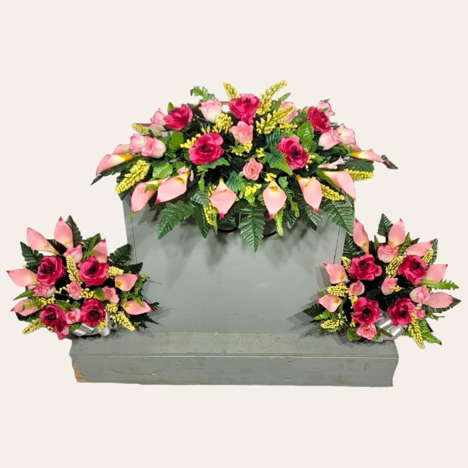 This beauty pink calla lily and rose headstone saddle and cone pair is a grave decoration. This set is made with faux floral silk grave flowers such as roses, rosebuds, baby's breath, calla lilies, and silk fern all mounted on a quality metal saddle frame with four legs and protective rubber coverings to protect and secure your grave saddle.