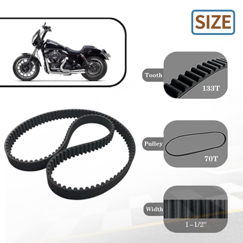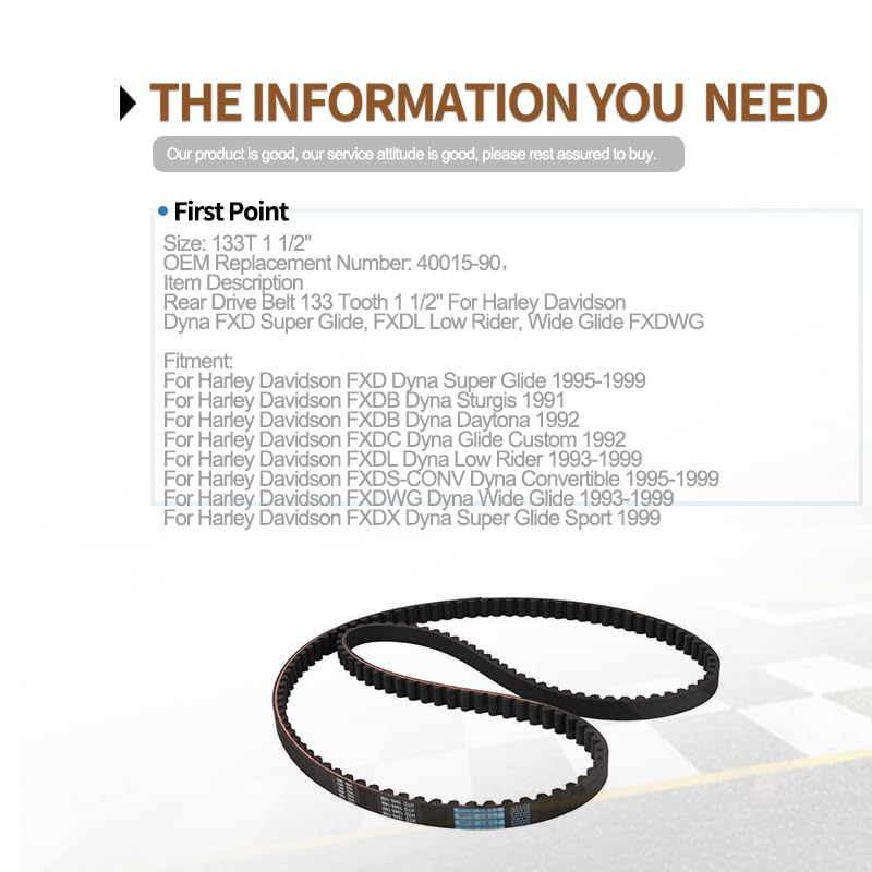 Rear Drive Belt, Perfectly Unleash Motorcycle Power!Product Features:Name: Rear Drive BeltSize: Width: 1-1/2" / 38.1mm Tooth: 133TPulley: 70 toothMaterial: Premium RubberInstallation Position: RearAnti-fracture, anti-aging, stable performanceCondition: 100% Brand NewReplacement Part Number:Replace 40015-90 1204-0050Fitment:Compatible withHarley Davidson FXDB Dyna Sturgis 1991Harley Davidson FXDC Dyna Glide Custom 1992Harley Davidson FXDB Dyna Daytona 1992Harley Davidson FXDWG Dyna Wide Glide 1993-1999Harley Davidson FXDL Dyna Low Rider 1993-1999Harley Davidson FXD Dyna Super Glide 1995-1999Harley Davidson FXDS-CONV Dyna Convertible 1995-1999Harley Davidson FXDX Dyna Super Glide Sport 1999
