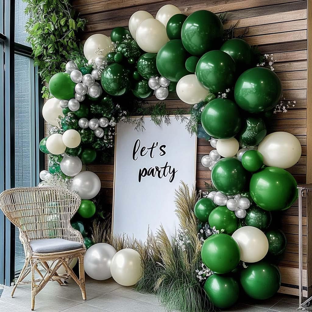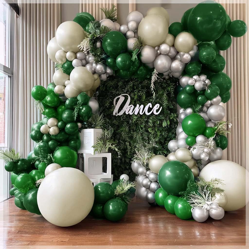 How to make a dark green white balloon garland? Step 1: Blow up double stuffed balloon garland kit with a balloon pump then tie knots(tie inside one), Pull the knot of the balloon through the big hole in the balloon chain, then pull it into the small hole next to big hole and snap it. Step 2: Randomly combine different size balloons and colors with balloon chain .Measure and cut the balloon chain to the desired length,leaving extra on each end for hanging the decoration with balloon strip later. Step 3: Use balloon glue dots to glue some remaining balloons to the already made yellow balloon arch to make the balloon shape more layered and catch eyes. Step 4: Make it more gorgeous looking, add some eucalyptus, curling ribbon, flowers, leaves, tulle, or more.