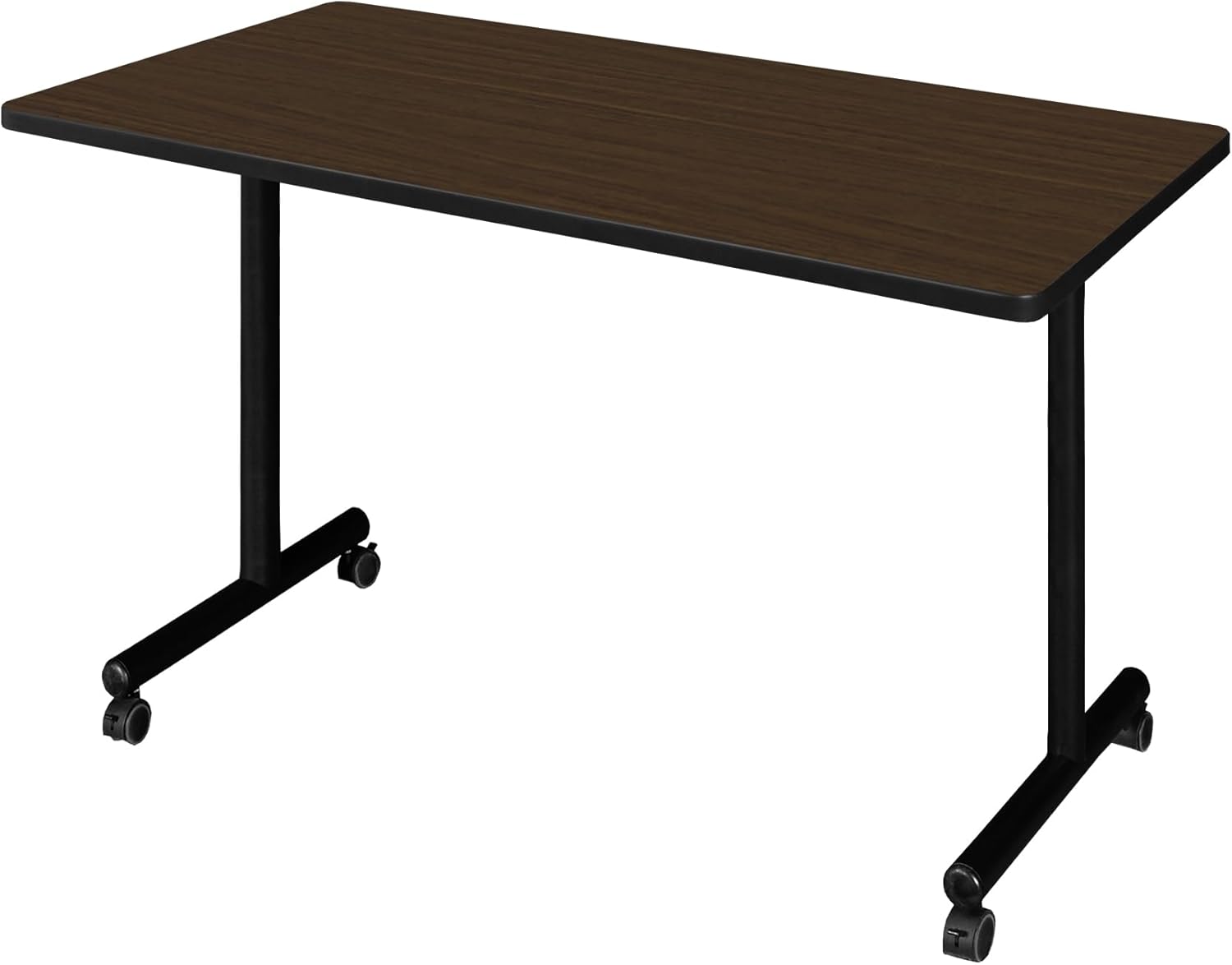 The 72" mobile rectangular training table is constructed of thermal fused melamine that protects against stains, burns, bumps and bruises. A black PVC edge adds extra protection. The Kobe t-base legs are constructed of a black tubular steel with a textured powder coat finish. The table feet feature locking casters that make this table ideal for computer, craft, lab or training rooms.