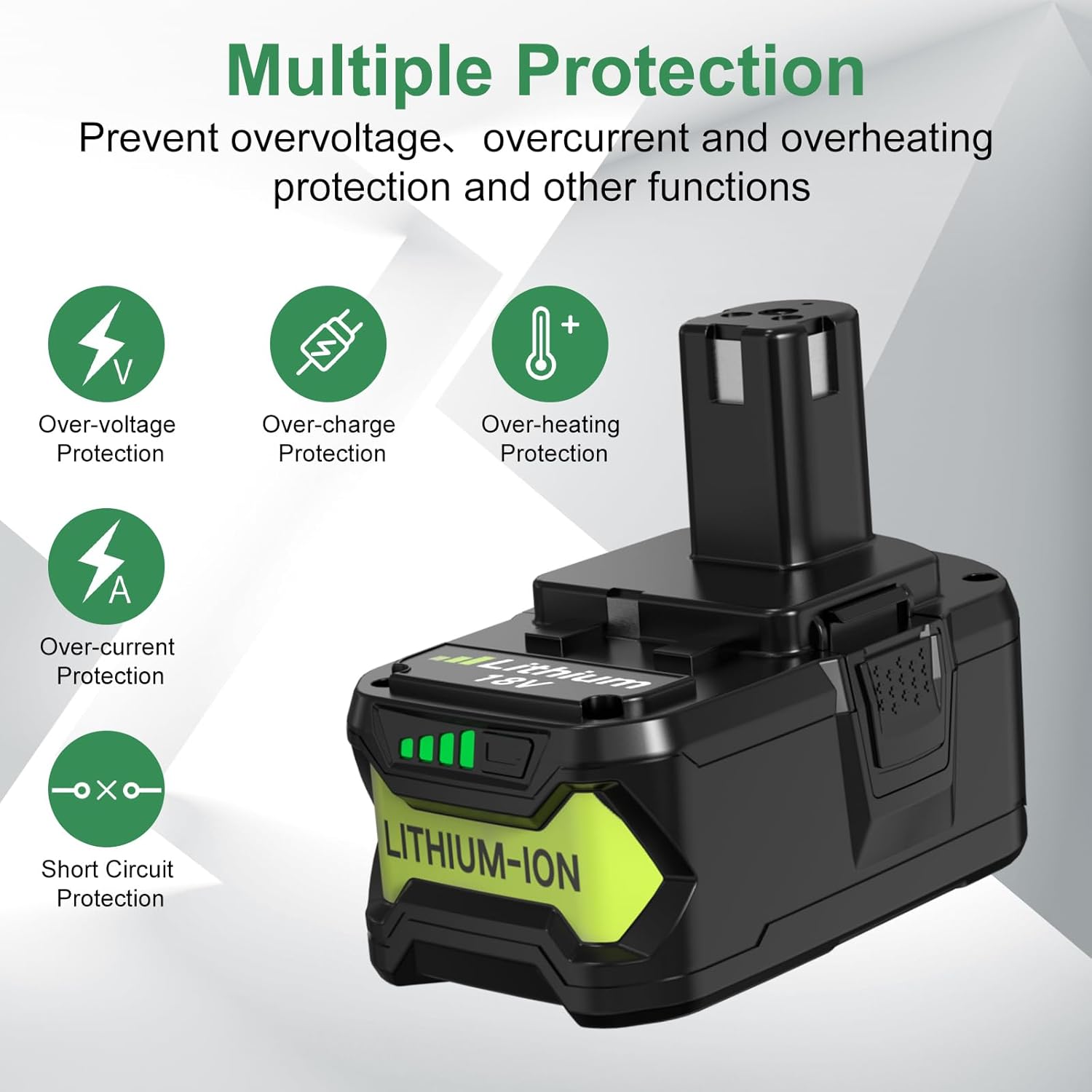 【Item Specification】Battery Type: Lithium ion | Voltage: 18 Volt | Capacity: 8.0Ah | Wattage: 144Wh | Input: 100V-240V| Output: 9.6V-18V| Replacement Charger Models: P117 P118 P119| Package: 2 Pack replacement for Ryobi 18V battery and charger