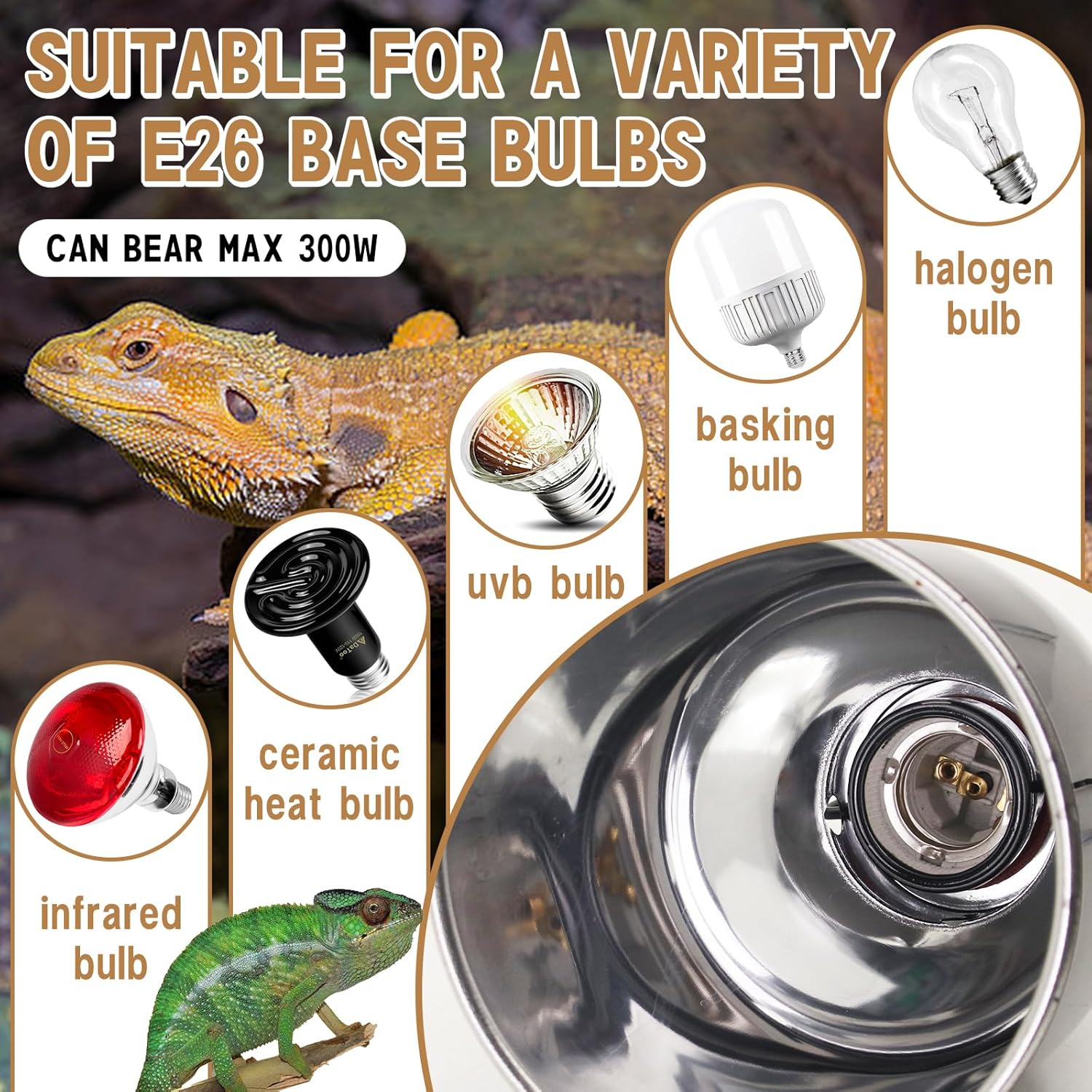 【Intelligent Thermostat Contro】Reptile light fixture with dimming thermostat adopts precise thermostat mode to maintain the temperature stably, precise sensors that can sensitively detect the current temperature and make adjustments, so you can keep the reptile heat lamp at a constant temperature at any time.providing an adjustable range of 32°F - 122°F to ensure the stability of the reptile growing environment. 【High Quality & High Reflection】Our 5.5-inch optical reflection deep heat projector reptile is made of high-quality aluminum that effectively reflects heat and increases brightness, which can significantly increase the output of UVA and UVB. 【Safe & Durable Design 】 Adopts high temperature resistant ceramic lamp head, standard E26 base, can withstand up to 300W power, suitable for a variety of reptile bulbs including UVB bulbs, ceramic heat lamps, infrared heat lamps, basking bulbs. 【Easy to Use & Wide Applicability】This reptile light comes with a hook, the hook is made with heat insulation and insulated design, it can be used to hang on the reptile light stand. Easy to move and mount the light in any position, infrared reptile light is suitable for reptiles, amphibians and small animals such as bearded dragons, geckos, turtles, tortoises, lizards, snakes, spiders, rabbits, hedgehogs, birds, hamsters, chameleons, frogs, toads, cockatiels, and more. 【High Temperature Warning】 Avoid touching the lampshade by people and pets when using to prevent high temperature burns.