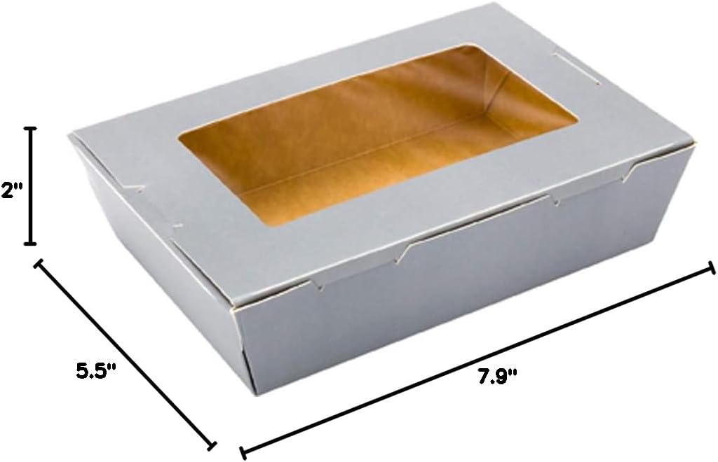 Pack up delicious entrees or delightful desserts in our Cafe Vision 42-ounce Gray Paper Take Out Containers. Constructed from premium paper with a grease-impervious lining, these reprocessable to go boxes easily contain leftover savory mozzarella sticks or sweet triple chocolate brownies, and they're conveniently disposable. With 4 built-in lock tabs, these durable take out containers securely lock in your delicious dishes, making them great for take out and delivery services at your restaurant, bakery, cafe, and more. Featuring a clear plastic window and a chic gray finish, these boxes to go show off the vibrant colors and tasty flavors of any dish served in it. Containing up to 42 ounces, these medium food containers measure 7.9 inches long by 5.5 inches wide and 2 inches tall. Sold in a 200 count box.