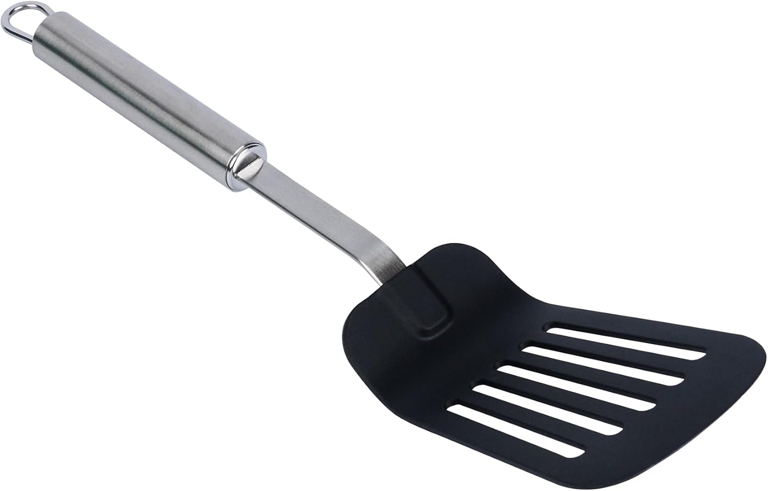Enhance kitchen efficiency with high-heat resistant utensils. The German Standard Heat-Resistant Slotted Turner – Black, Stainless Steel, Ergonomic Grip – 12.4 inches is crafted from high-heat resistant nylon, ensuring durability and safety in handling hot foods without melting or warping. Its slotted design efficiently drains excess oils and liquids, making it an ideal nylon spatula for flipping and serving fried or sautéed foods. The stainless steel handle provides a sturdy grip, enhancing control and longevity, perfect for rigorous kitchen use and a reliable fish spatula. Its dishwasher-safe nature ensures efficient cleaning routines. Elevate your culinary operations with this versatile slotted turner. Each order includes 6 German Standard Heat-Resistant Slotted Turners.