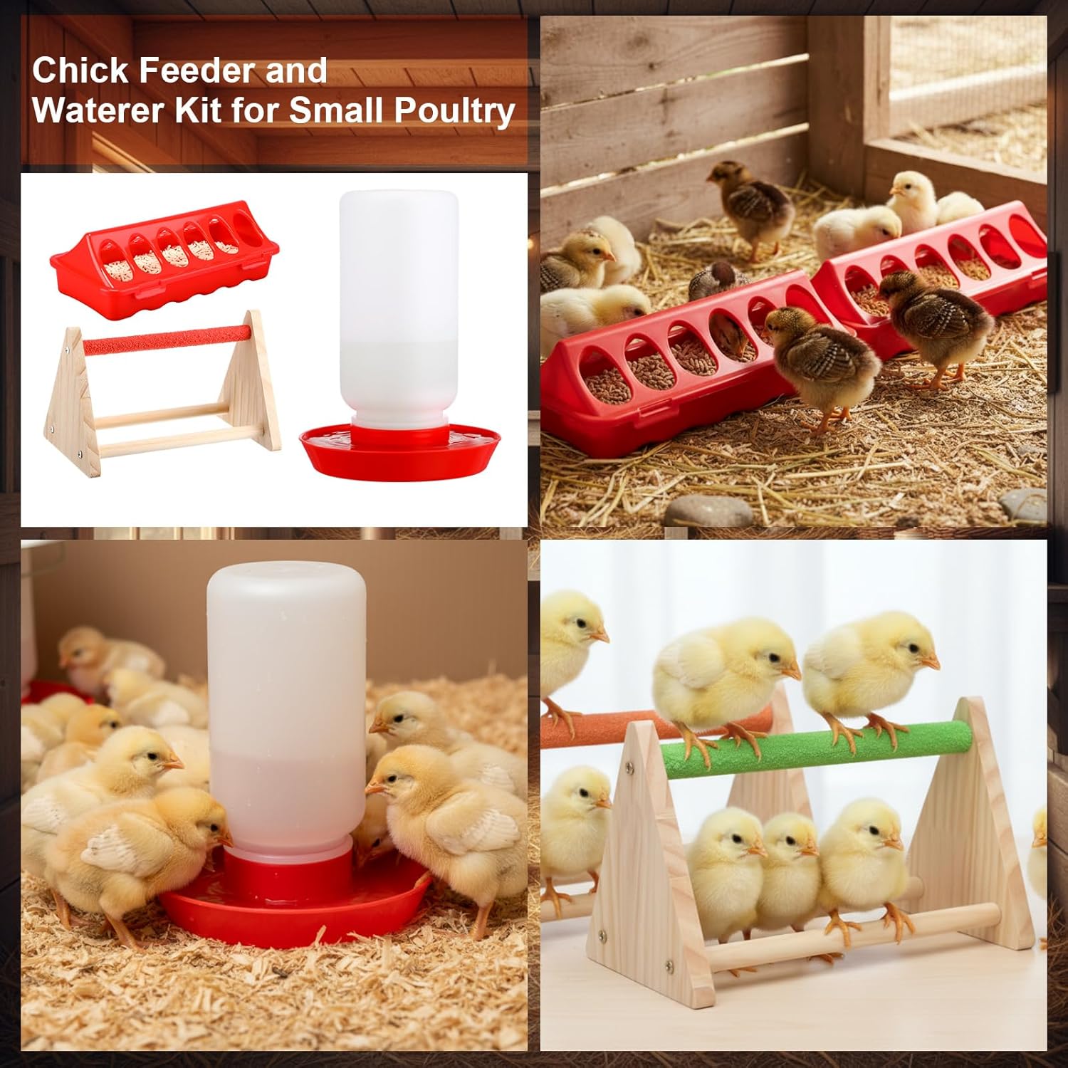 Features: Widely Used Our chicken starter kit is suitable for all kinds of small poultry: chickens, ducks, quail, birds, pigeons and so on. You can use it not only in chicken coops and brooding rooms, but also in brooders outdoors, on farms Durable Material This chicken starter set is made of quality, sturdy plastic that's resistant to breakage and won't deform after extended use. Our complete starter set will keep your chicks happy and healthy. Specifications: Material: plastic Color: red Size: Chicken Brooder Heater Lamp about 19.69 inches/ 50 cm Chick feeders about 7.9 x 3.3 x 2.5 inches Chick waterer about 5.85 x 8.19 inches Chick perches about 8.19 x 4.8 x 4.88 inches Package includes: 1x Chicken Brooder Heater Lamp 2 x Chick feeders 1 x Chick waterer, 2 x Chick perches Notes: Manual measurement, please allow slight errors on size. The color may exist a slight difference due to different screen displays Small items are included, please keep them away from pets in case of choking risk. Before purchase, confirm whether the product size is suitable for your pet, and observe the pet's reaction when using. Please remove the product in time if there is any discomfort
