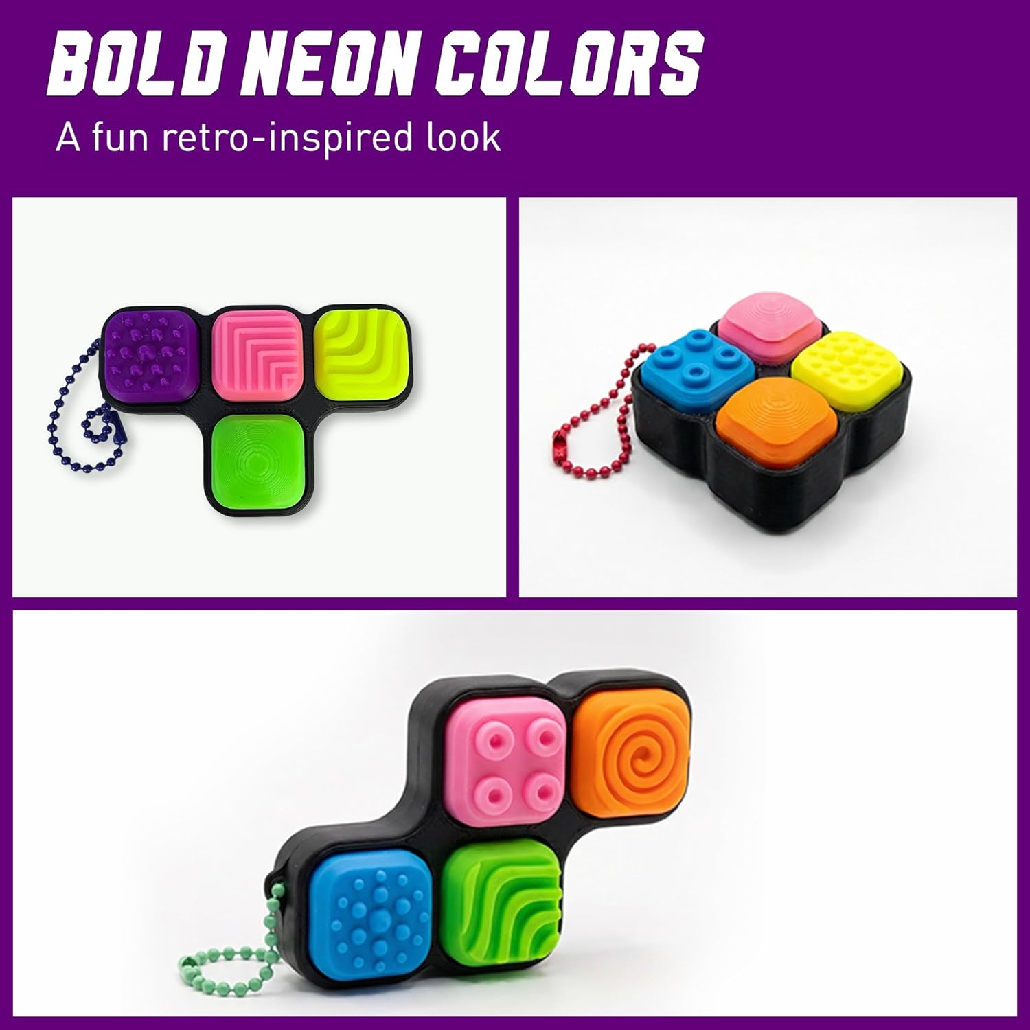 Add a nostalgic pop of color to your daily fidget routine with the Flipp 3D Retro Clickers — a set of 3 assorted neon texture cubes built for tactile engagement and stress relief. Each compact cube features a distinct raised pattern — spirals, bumps, grids, and ridges — giving fingers plenty to explore while delivering satisfying sensory feedback. The neon tops contrasted with a sleek black base create a retro arcade-inspired look that's as cool to display as it is to use. Designed for ages 14 and up. Built for everyday fidgeting, these texture cubes are ideal for clicking, pressing, and rubbing to help manage stress, support focus, or simply keep hands occupied during work sessions, commutes, or online meetings. Each cube includes a built-in loop with a small chain for easy clipping onto keys, backpacks, lanyards, or pencil cases — so sensory relief is always within reach. The Flipp 3D Retro Clickers set includes three assorted neon clickers, each with a unique surface texture for a varied tactile experience across the set. Compact, durable, and designed for repeated daily use, they make a distinctive gift for fidget accessory enthusiasts, sensory seekers, and desk accessory collectors. Whether used as keychain fidgets, desk companions, or stress-management tools, these cubes deliver playful texture and retro style in every squeeze and click.