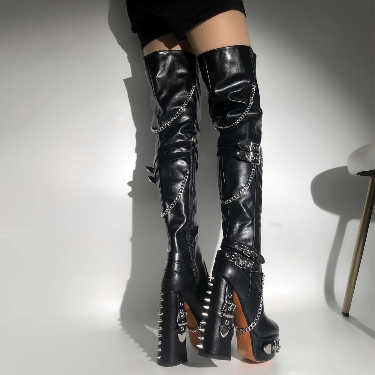 | Embellishment Feature | block heels, chains decor, platform heel, tall boots, zippers |