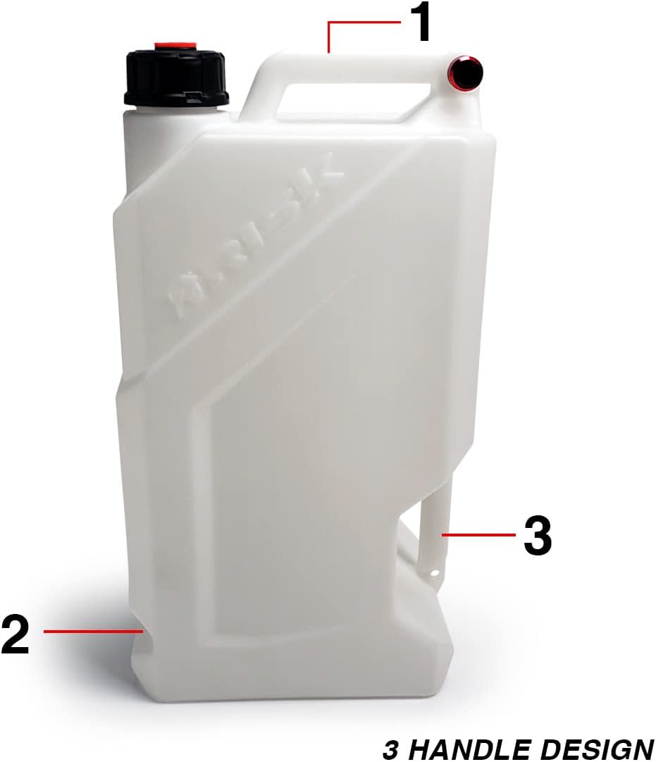 DescriptionRisk Racing is excited to report that their EZ3 Utility Jug is a success! So much so that they have chosen to add to the Utility Jug family by introducing the all new EZ5 Utility Jug! The EZ5 is a 5-gallon (20L) Utility jug with all the same features as the loved EZ3. It remains a visual standout with its sharp and aggressive design, but it doesn’t stop at looks. Risk has identified the challenges surrounding utility jugs and developed smart solutions to make life easier when dealing with fluids. This jug solves the trials and tribulations common with transport, pouring, and even venting. The EZ Utility Jugs are exactly what the name implies, easy to use! They have a triple handle design that is completely unique. The top handle and side handle are obvious, but it is the third fingertip handle at the front of the jug that comes in handy during the end of the pour. This triple handle design allows the user to carry and pour at any angle with comfort and control. Use the EZ jugs with confidence knowing that they are constructed from thick-walled, high-density polyethylene, ensuring they are durable enough to hold up to any fluids you may transport. All gaskets are made from virgin nitrile rubber for chemical resistance, and they are replaceable. The EZ Utility Jugs also solve the all too familiar problem of liquid spilling from the vent hole, which is typically placed entirely too close to the spout, so, “When you’re filling, you’re spilling”. Risk placed their anodized aluminum breather on the very back of the top handle, keeping it far from the spout, and ensuring plenty of venting without the spills. In addition, this durable aluminum breather is slotted so it acts like a throttle to control your pour speed. Another common utility jug challenge is transportation. Safely securing a utility jug for transport can be a hassle, and tip overs can be a terrible mess, however Risk has solved this issue as well. The EZ Utility Jugs have a heat treated, spring steel floor mount which can be mounted in a trailer, van or truck bed. The EZ Utility Jug then snaps right in place, preventing it from falling over during transit. The EZ Floor Mount fits both the 3-gallon & 5-gallon EZ jugs. Additionally, a padlock can be placed through the EZ Floor Mount to securely lock the EZ Utility Jugs to your truck or trailer, protecting your investment. Customers can choose to pair their EZ Utility Jugs with the new and improved Hose Bender spout, which features an anodized aluminum cap with a lanyard & hook system that forms the flexible hose into the perfect pouring position.