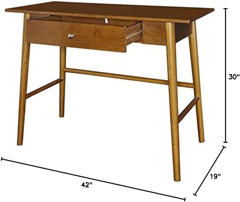 Whether you’re working from home or just need a comfortable place to pen correspondence, this modern desk is an elegant addition to your home. Its mid-century design features sturdy rounded legs set at an angle and an expansive workspace. The front drawer, adorned with a simple black knob, provides storage for supplies. Finished in a warm walnut shade birch veneer, this desk will complement any decor or room, including the office, bedroom, kitchen or living room. It’s most at home with similar pieces in the same collection.Features:- Material: Rubberwood, solid wood, MDF, birch veneer and metal hardware- Finish: Warm walnut- Spacious top and drawer for storage- Sleek mid century design with simple black drawer knob- Elegant desk for a home office, bedroom, kitchen or living room- Durable solid wood and veneer construction- Sturdy rounded legsSpecifications:- Product Dimensions: 29.63"H x 42"W x 19"D- Product Weight: 35.28 lbs- Weight Capacity: 100 lbs- Assembly Required: Some Assembly Required