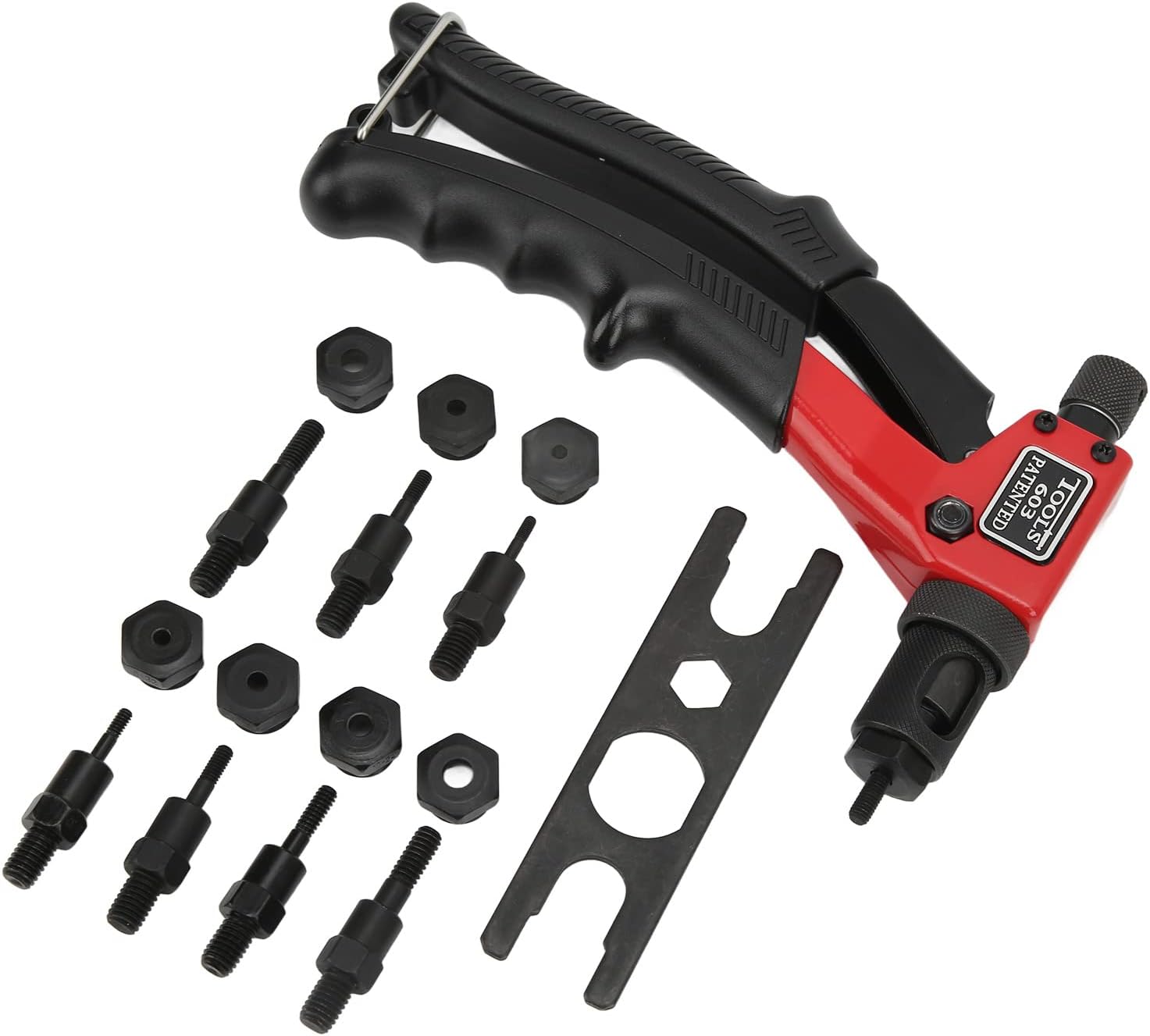 Item Type: Manual Riveting Kit Material: metal. Maximum working stroke: Approx. 7 mm/0.276 inches. Maximum Working Effective Stroke: 6mm/0.236" Maximum multiple arm strength: 25 times Application: Universal Package List: 1 x Manual riveter (M5 screw nut is installed on it)8 x plastic box 1 x Multifunctional Wrench 1 x M3 Mandrel 1 x M3 nut. 1 x M4 Mandrel 1 x M4 Nut 1 x M6 Mandrel 1 x M6 Nut 1 x Mandrel 10-24 1 x Nut 10-24 1 x Mandrel 1/4-20 1 x Nut 1/4-20 1 x Mandrel 6-32 1 x 6-32Nut 1 x Mandrel 8-32 1 x Nut 8-32 1 x Manual