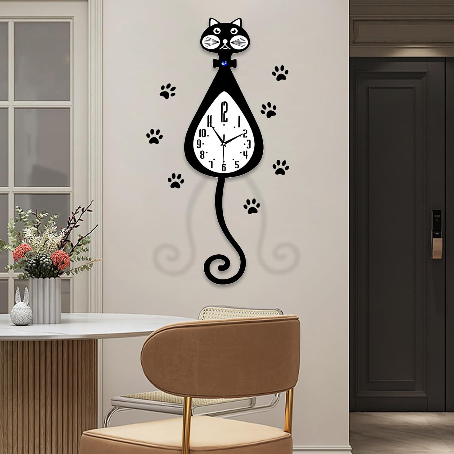 With this funny cat wall clock,your wall will become simple,stylish and beautiful.Its wagging tail and personality shape will bring great joy to your children.The cat clock is suitable for office,living room,bedroom,background wall and any modern room wall. Detailed Description: Material: Wooden MDF Size: 70×20 cm/27.55×7.87 inch (manual measurement, please ignore the error) Power: 2 AA carbon batteries (not included in the package)