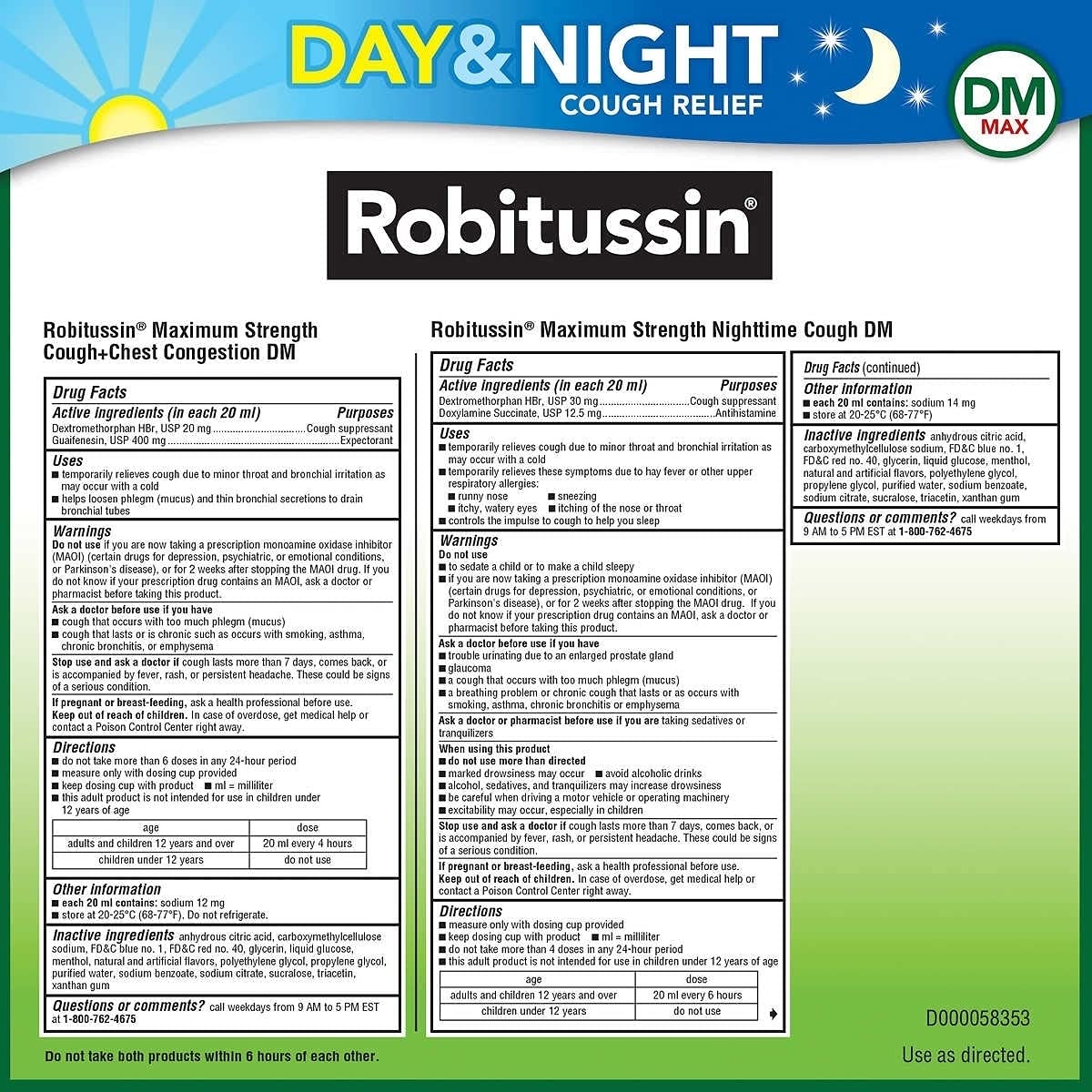 Robitussin DM Max Cough and Chest Congestion Day and Night provides powerful, maximum strength relief for both daytime and nighttime symptoms of cold and flu. This combo pack includes three 20 oz bottles, delivering a total of 60 oz of effective liquid medicine to relieve your worst cough and chest congestion, day and night. The formula combines a daytime cough suppressant and nighttime antihistamine to give you the best of both worlds. Whether you're looking for relief from persistent coughing, chest congestion, or difficulty sleeping due to cold symptoms, Robitussin DM Max has you covered with its dual-action approach.