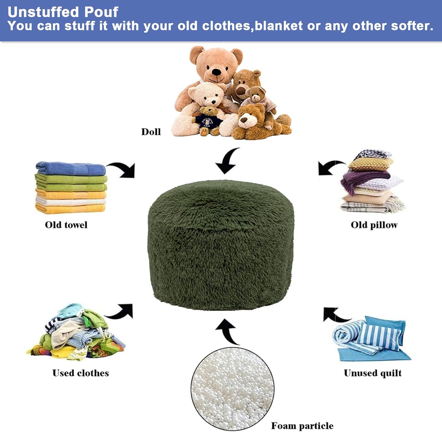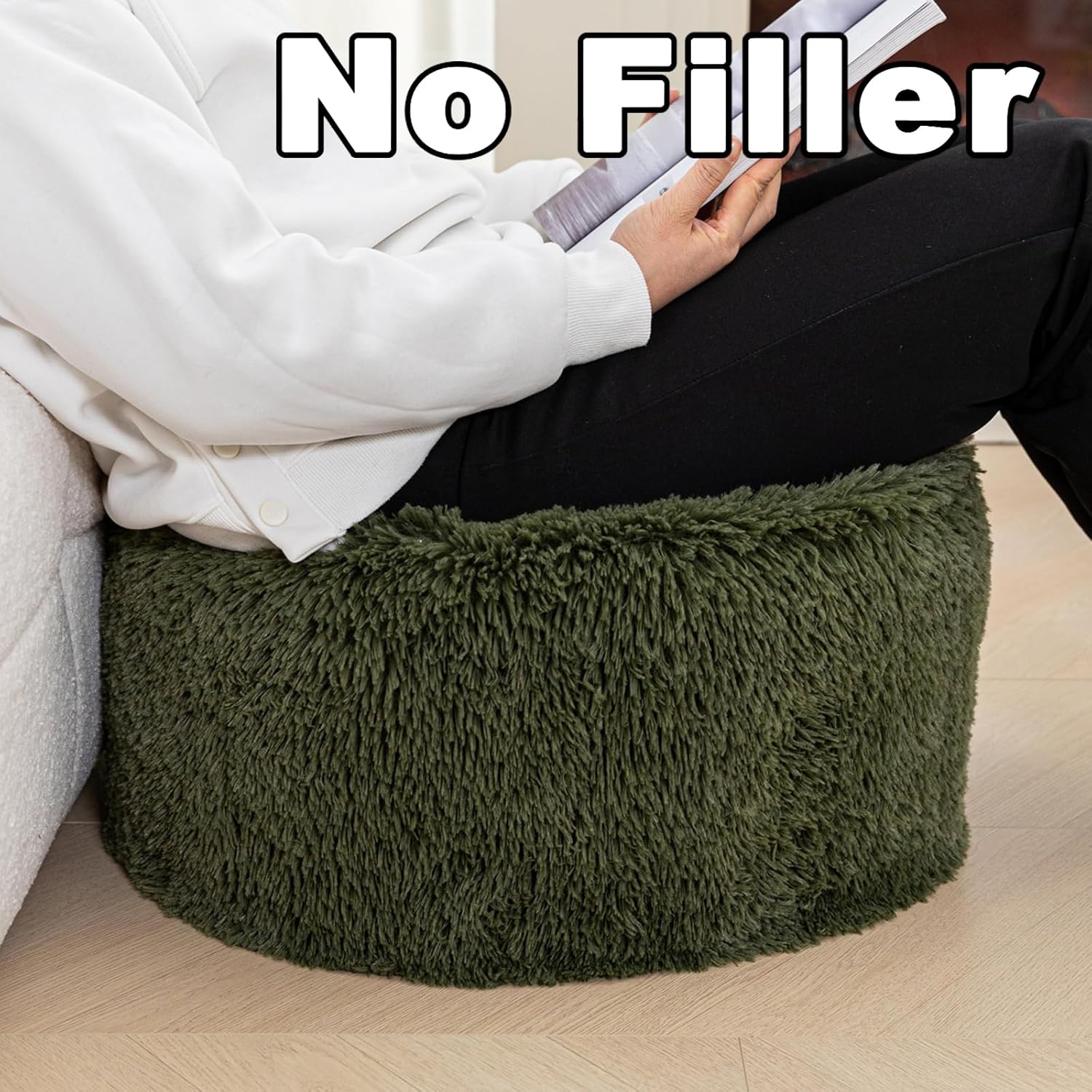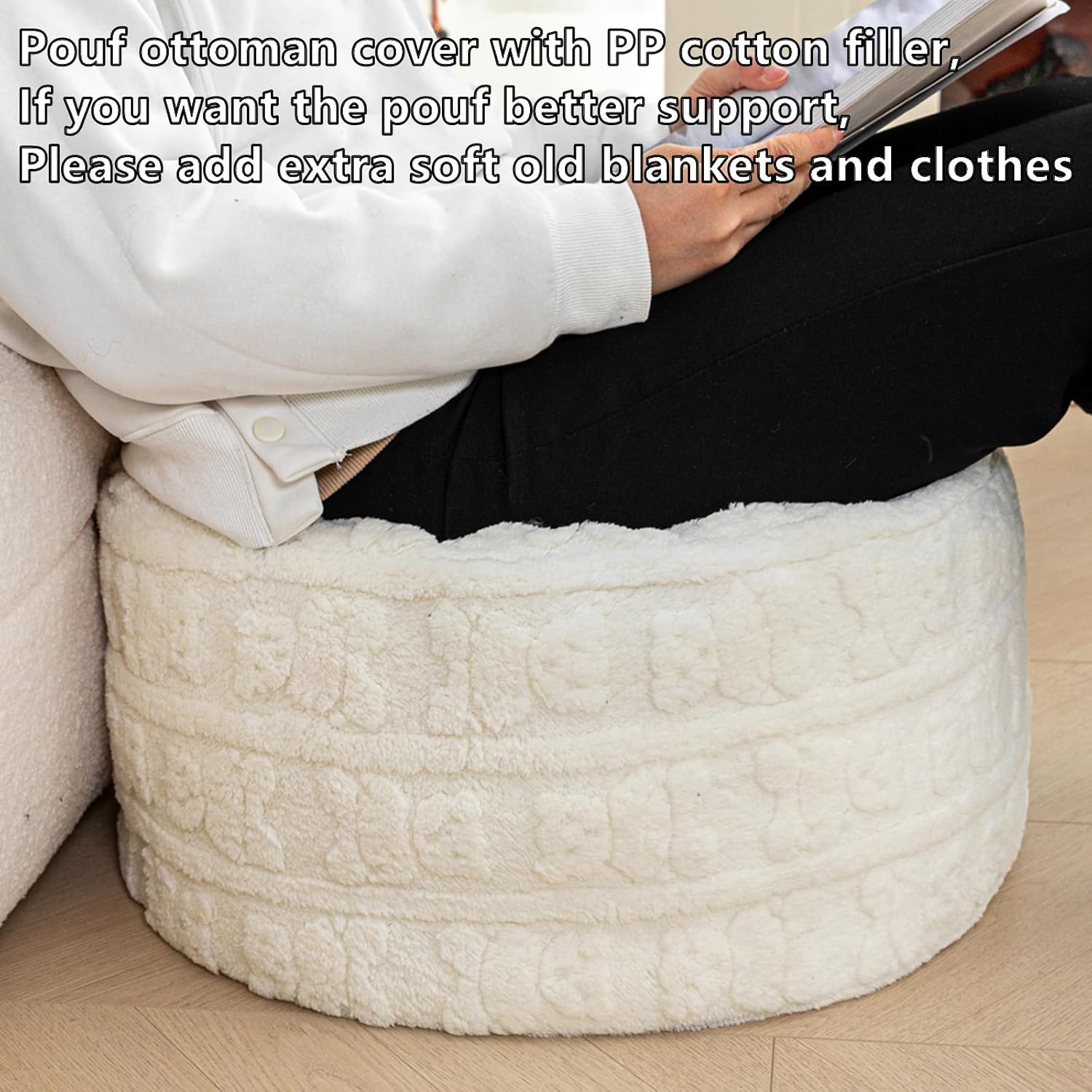 Product description Color:Black | Size:20 In Diameter * 12 In High Product Name: Stuffed Round Pouf Ottoman Fur Pouf Footrest,Foot Stool, Bean Bag Floor Chair for Bed Room Living | Room | Accent Seat 20x12inches with Filler Material: High quality Plush Fiber Stuffed Size: 20Inches dia. and 12Inches high 【Extremely Comforatable Pouf Ottoman Cover】This pouf ottoman cover adopts plush fiber with thick backing,fluffy and durable, holds its shape perfectly,gives a softest feeling for your feet with our fluffy ottoman foot rest.【Pouf with Filler】Stuffed pouf ottoman ships to you with PP Cotton Pouf Filler. You don't have to think about what to stuff with, also save your money on stuffing. Just put the PP cotton Pouf Filler into the cover. This pouf filling comes in an inner liner, so you don't have to worry about any mess. 【Storage】This Ottoman pouf cover comes stuffed,if you think it does not support well, you can fill in some blankets, sweaters, pillow cushion, winter clothes, plush toys. 【Multi-function】 After you fill this cover, it could perfectly use as ottoman poufs, foot stool, foot rest, bean bag chair,seating cover, storage solution for wedding, home décors, etc. 【Large Round Opening on the Bottom With Double Zippers】Research reviews find too many complaints on small opening and broken zipper,we develop the large opening on the bottom. And we adopt double zippers,it is easy for stuffing and durable for using. Package Content: 1 x Pouf Ottoman with Filler Tips: Do not dry clean. Do not iron. Do not use sharp objects to scratch or scrape the surfaces of the Pouf Ottoman. Use mild faux fur cleaner, detergent or solvent-based cleaners when needed.