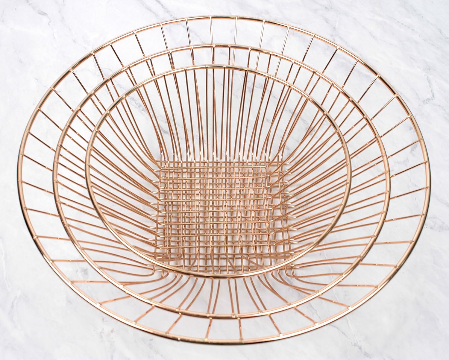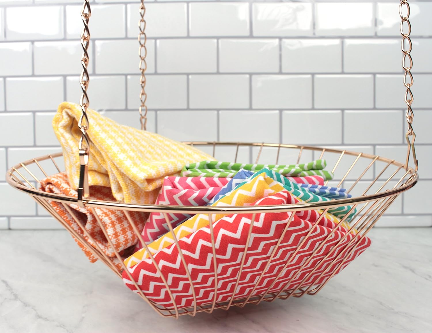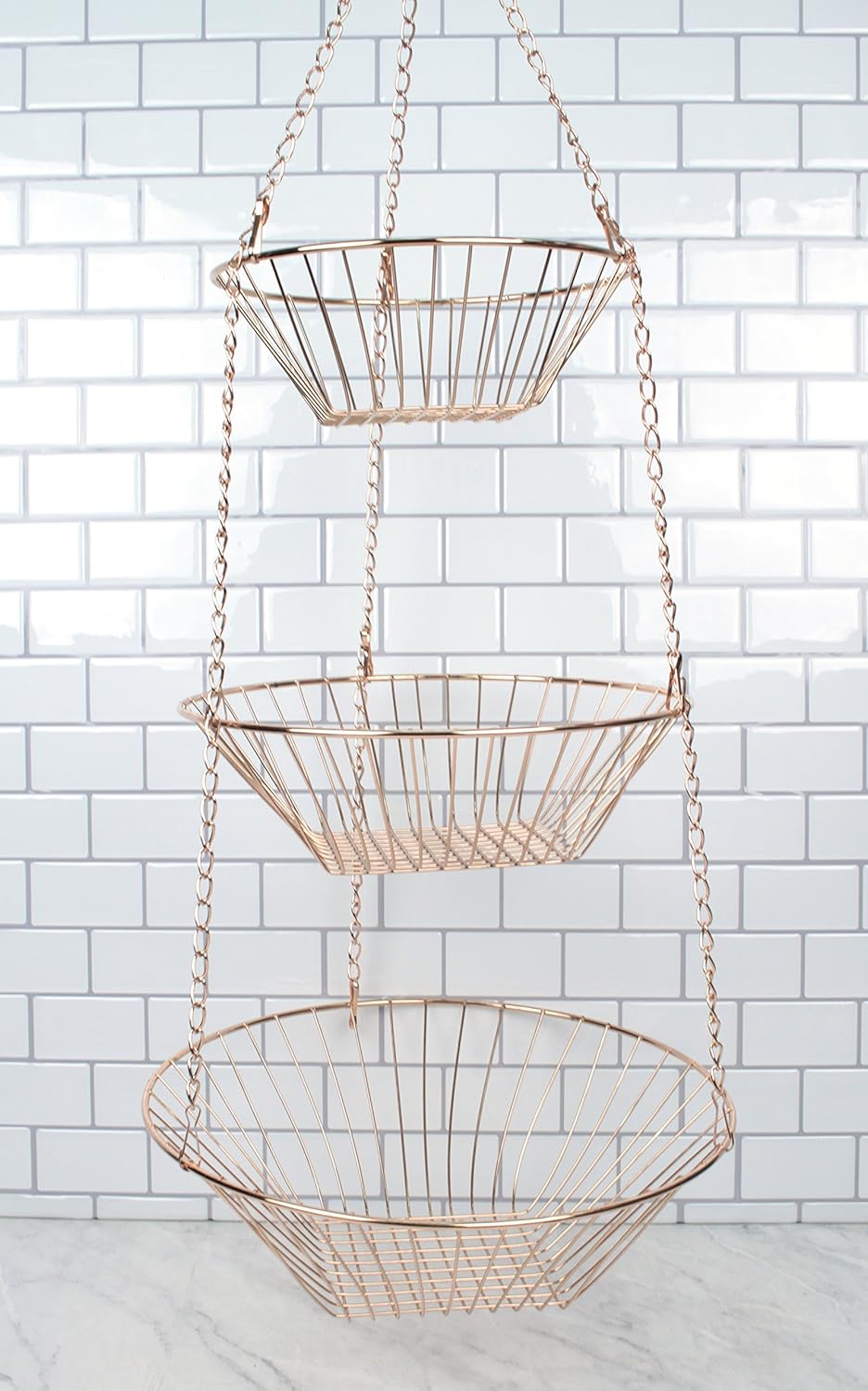 Basket holds up to 10 pounds, and measures 8 inches, 10 inches and 12 inches in diameter with a 30-inch overall length when hung. Great for storing fruits and vegetables while allowing air to circulate keeping your produce fresh and healthy. Organize your kitchen, bath, laundry room, kids room, art supplies, pet toys, and more. Hang this elegant basket or split it apart into 3 handy storage baskets. Woven steel wire construction provides durability, while also adding a pleasant design piece. Hand wash.
