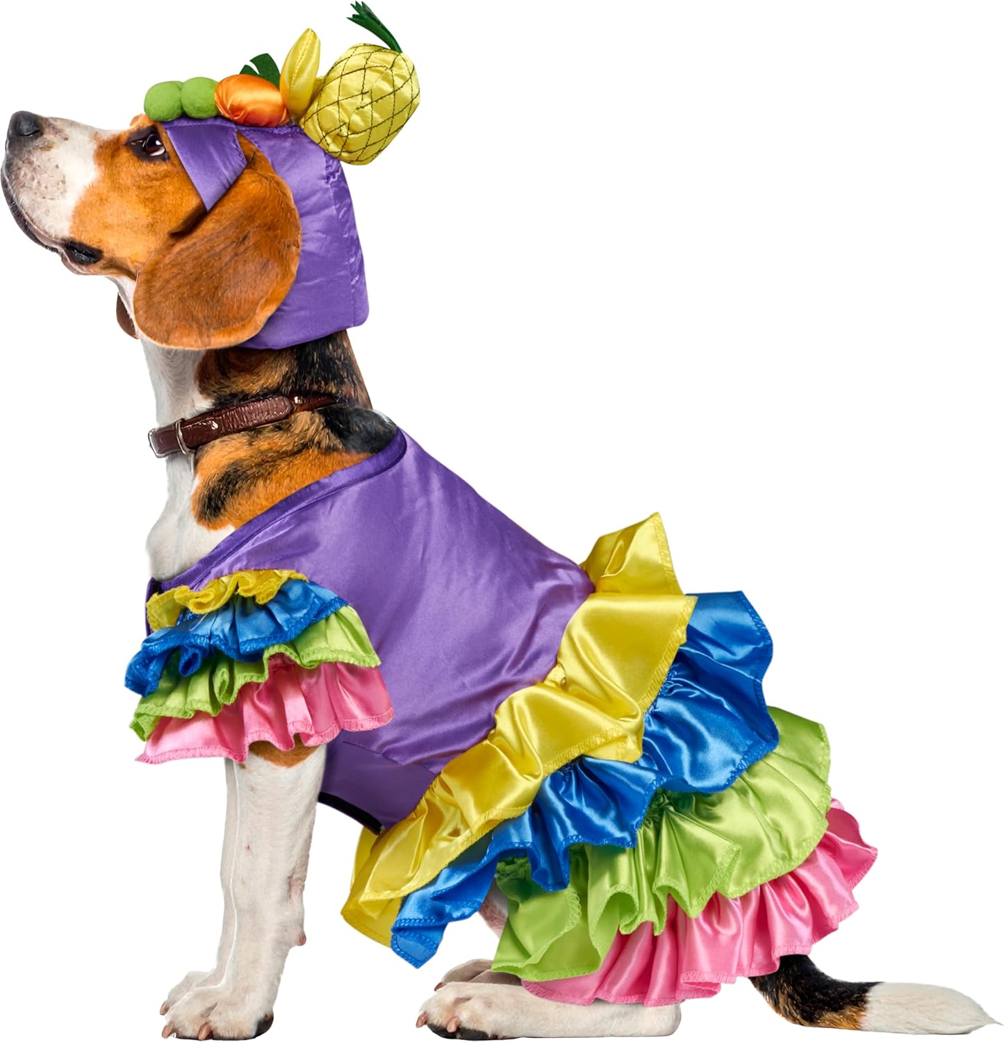 Turn up the tropical charm with the Brazilian Bombshell Pet Costume by Rubies! This vibrant and playful costume features a colorful dress with layered ruffles and a plush fruit hat that sits adorably atop your dog or cat’s head. Inspired by classic samba style, this outfit brings festive flair and carnival energy to your pet’s look. Whether it’s for Halloween, themed parties, pet parades, or fun photo shoots, your furry friend will be ready to dance their way into everyone's heart. Easy to wear and bursting with personality, this costume is perfect for pet parents who love bold style and big smiles. Let the fiesta begin—your pet is the star of the show!Since 1951, Rubies has been a trusted name in fun, offering safety-tested costumes, wigs, masks, and accessories for kids, adults, pets, and décor. Now part of a global family of brands, Rubies delivers both licensed and original styles designed with quality, comfort, and creativity in mind. From Halloween to everyday play, our wide assortment helps bring imagination to life with on-trend looks and iconic characters. With over 70 years of experience, Rubies continues to inspire unforgettable moments for the whole family—year-round.