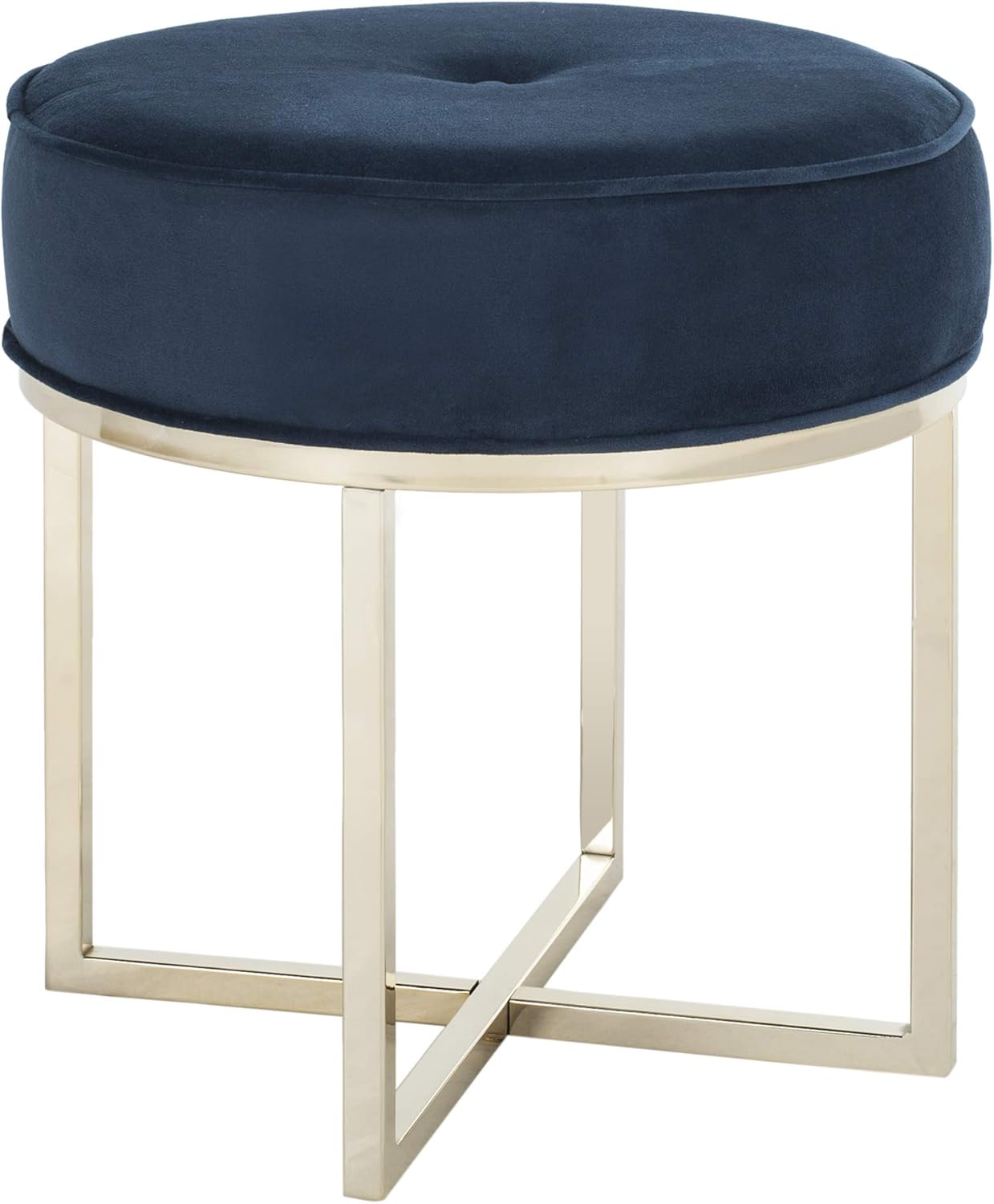 A perfect pairing of minimal lines while still conveying luxurious style, this contemporary round ottoman updates any living room. Designed with velvet upholstery in a soothing navy hue, it complements any décor. Its modern brass legs add an elegant sculptural touch.