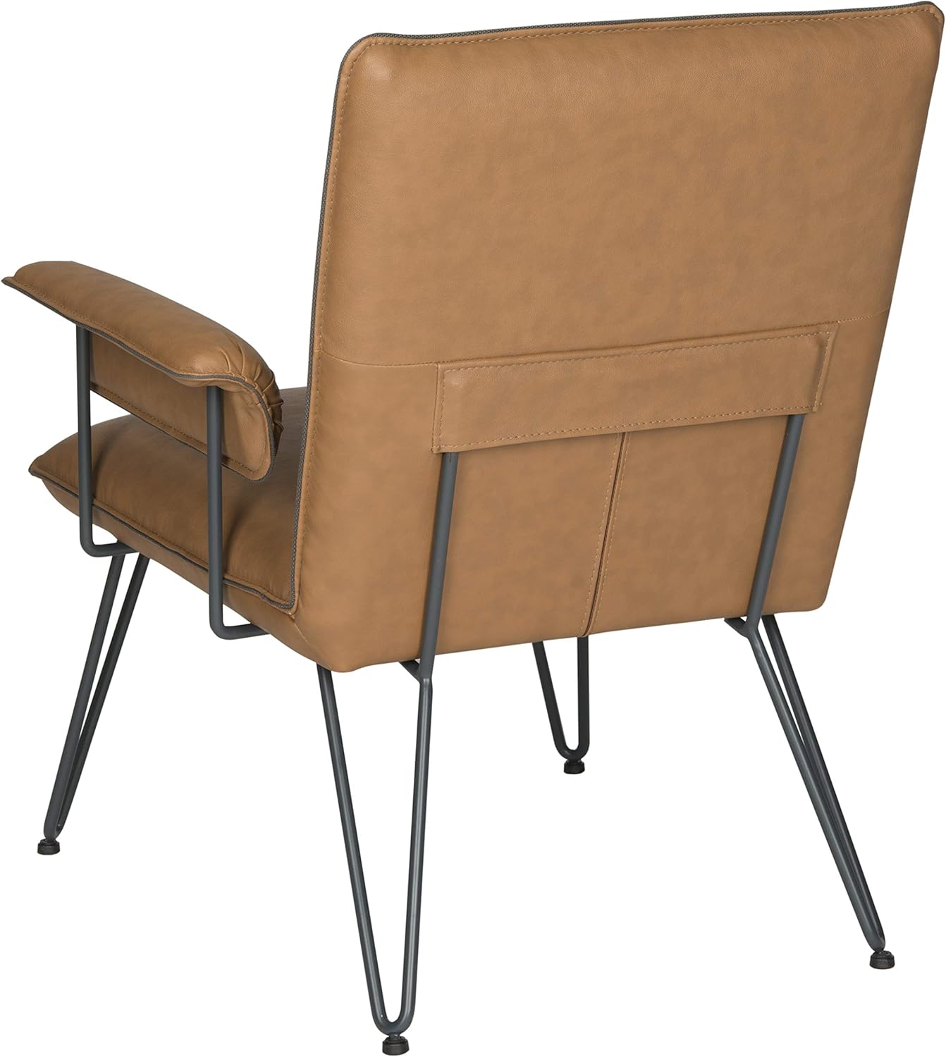 Retro Modern design is celebrated in this streamlined arm chair softened with handsome camel PU leather upholstery for updated flair. Blue-grey powder-coated steel gives the hairpin legs a fashion edge for mid-century or contemporary interior settings.