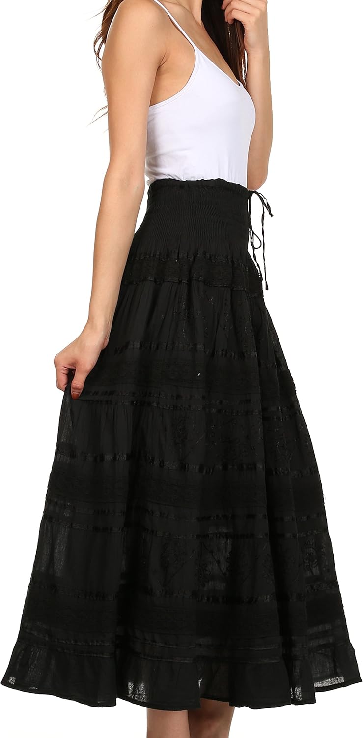 Women's cotton peasant skirt features beautiful embroidered detail, ribbon and lace accented tiers and smocked waist with drawstring.
