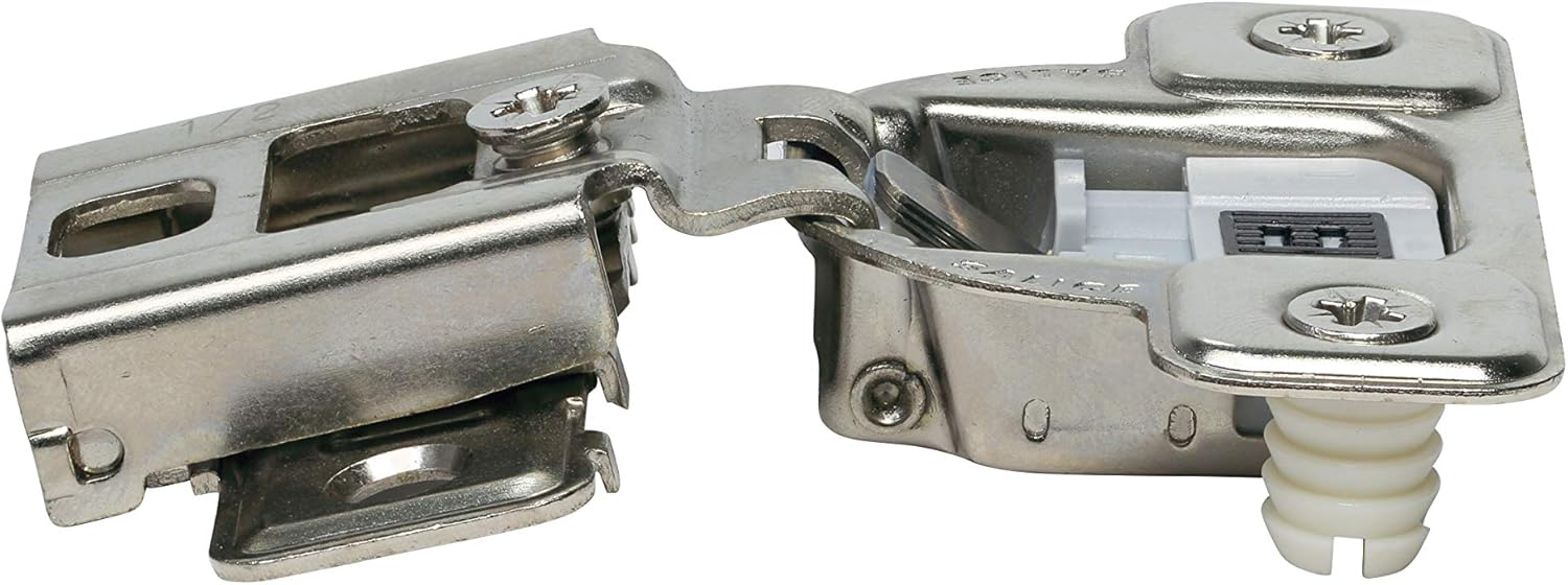 106 degree opening Press-in application 1/2" cabinet overlay Cup depth: 7/16" (11mm) Drilling distance of 3/32" (2.5mm) 3-cam adjustment Stamped steel Minimum door thickness of 9/16" (14mm) Maximum door thickness of 7/8" (22mm) Overlay: 1/2" Screw Hole Distance: 45mm Hinge Opening Angle: 106 Degree Closing Action: Soft Close Fixing Type: Press In Hinge Cup Drilling Depth: 7/16" (11mm) Hinge Cup Boring Diameter: 1-3/8" (35mm) Base Plate: Wrap Mount Hinge Series: Silentia E centhree Cabinet Type: Face Frame Side Adjustment: +2.5mm (+3/32") / -1.8mm (-1/16") Height Adjustment: +/- 1.85mm (3/32") Depth Adjustment: +2.5mm (+3/32") / -0.5mm (-1/64")