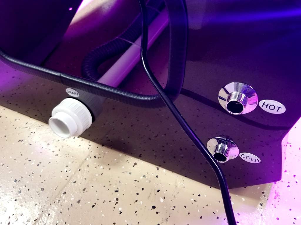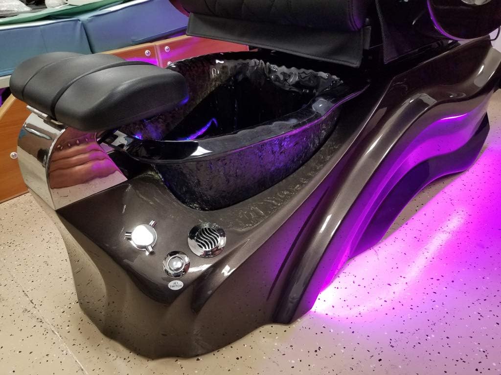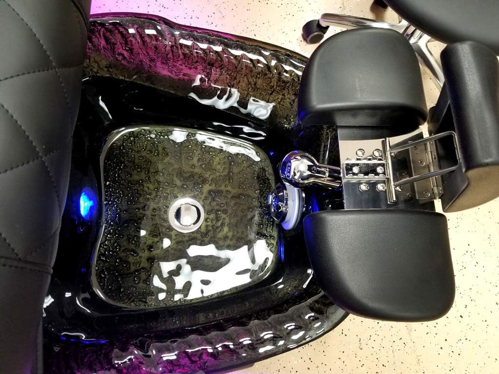 Latest Pipeless Jet Technology Human Touch Shiatsu Back Massage Chair Roller Assembly with Advanced Computerized Controller w/ Solid Wood Armrests + Side Tables 90 Degree Flip Up Side Tables on Both Sides Motorized Recline (Up to 130 Degrees) - Easy to adjust with remote Color Configuration: Black Chair, and choice of Dark Grey Basin or Gold Basin Magenta Color LED Strip Light Black PU Leather Operator Stool Included! High Quality Crystal Basin - Very Easy to Clean (5 Gallon Capacity) High Quality Sprayer Wand w/ 2 Water Settings Pipeless Jets - Push Button On/Off (LED Lights Automatic) Full Color Chromatherapy Color Changing Interior LED Light Thick High Quality Acrylic Fiberglass Reinforced Basin (Dark Grey) with Black Crystal Bowl 1/2" Incoming Water Connections (Hot / Cold) Very Easy To Install Drain Type - Gravity Fed. No Discharge Pump. (A plumber can install if needed) Operator Stool included! Air Vent Installed in Basin / Plumbing to meet all code approvals. Power Requirements: AC110V 60Hz, 750W Measurements: - Overall Assembled Size: 46" Wide (With both side tables up, 32" Wide with both down) x 60" Deep (Front to back) x 56" Tall (With backrest straight up) - Seat Size: 22.5" Wide x 20" Deep - Water Basin Size: 17" Wide x 17" Deep x 9" Tall - Stool Size: 18" Wide x 18" Deep x 26" Tall (Height adjustable) Product Net Weight: 265lbs. Gross Weight 328lbs. Crated Weight (For LTL transport) ~500lbs Manufacturer Approvals: CE, FCC, ROHS, SGS Full 1 Year Manufacturer Parts Warranty Included