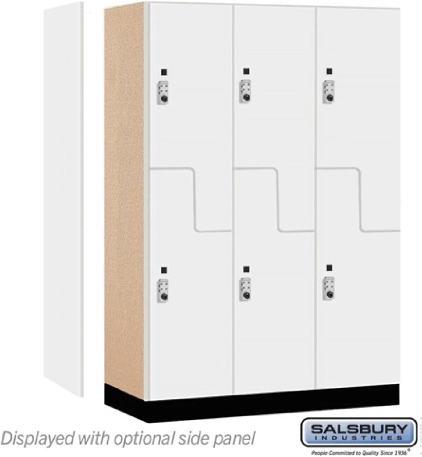 Salsbury 18" Wide Premier Wood Locker-Double Tier 'S' Style-3 Wide-6 Feet High-24" Deep-Arctic White-Silver Resettable Combination Locks Salsbury 18-47000 Series 18" Wide Double Tier S Style Premier Wood Lockers Specification: Constructed of industrial grade wood and covered with premier high-pressure laminate that is stain and scratch resistant with a decorative interior finish, Ideal for health clubs, locker rooms, country clubs, day spas, sports and athletic facilities or wherever a professional environment is desired, 50% wider than 12" wide premier lockers, Available in an arctic white, winter fog, carbon mesh, silver teak, red oak, or skyline walnut finish and include a black name /number plate, 18" wide premier lockers include a black laminated base and are 6 feet high (add 4" for base), 18" deep lockers have a compartment size that is 16-3/4" wide, 34-3/4" high and 16-3/4" deep, 21" deep lockers have a compartment size that is 16-3/4" wide, 34-3/4" high and 19-3/4" deep, 24" deep lockers have a compartment size that is 16-3/4" wide, 34-3/4" high and 22-3/4" deep, Each compartment includes a 5" deep shelf and a double prong ceiling hook, Available as 1 wide or 3 wide units, 1 wide units come fully assembled while 3 wide units require minor assembly, All locker doors are 18" wide x 3/4" deep, All locker doors include European soft close hinges and matching edge banding, Salsbury Industries is an ISO 9001: 2015certified company and has excelled in the field of manufacturing since 1936, Sloping hoods and side panels, Custom engraved black name / number plates, Flat top fillers, Sloping hood fillers, Vertical front fillers, Additional shelves, Premier padlock hasps, Premier resettable combination locks, Premier electronic locks, More Product Information, Installation Instructions, Technical Drawing, Specifications, Premier Wood Lockers Video