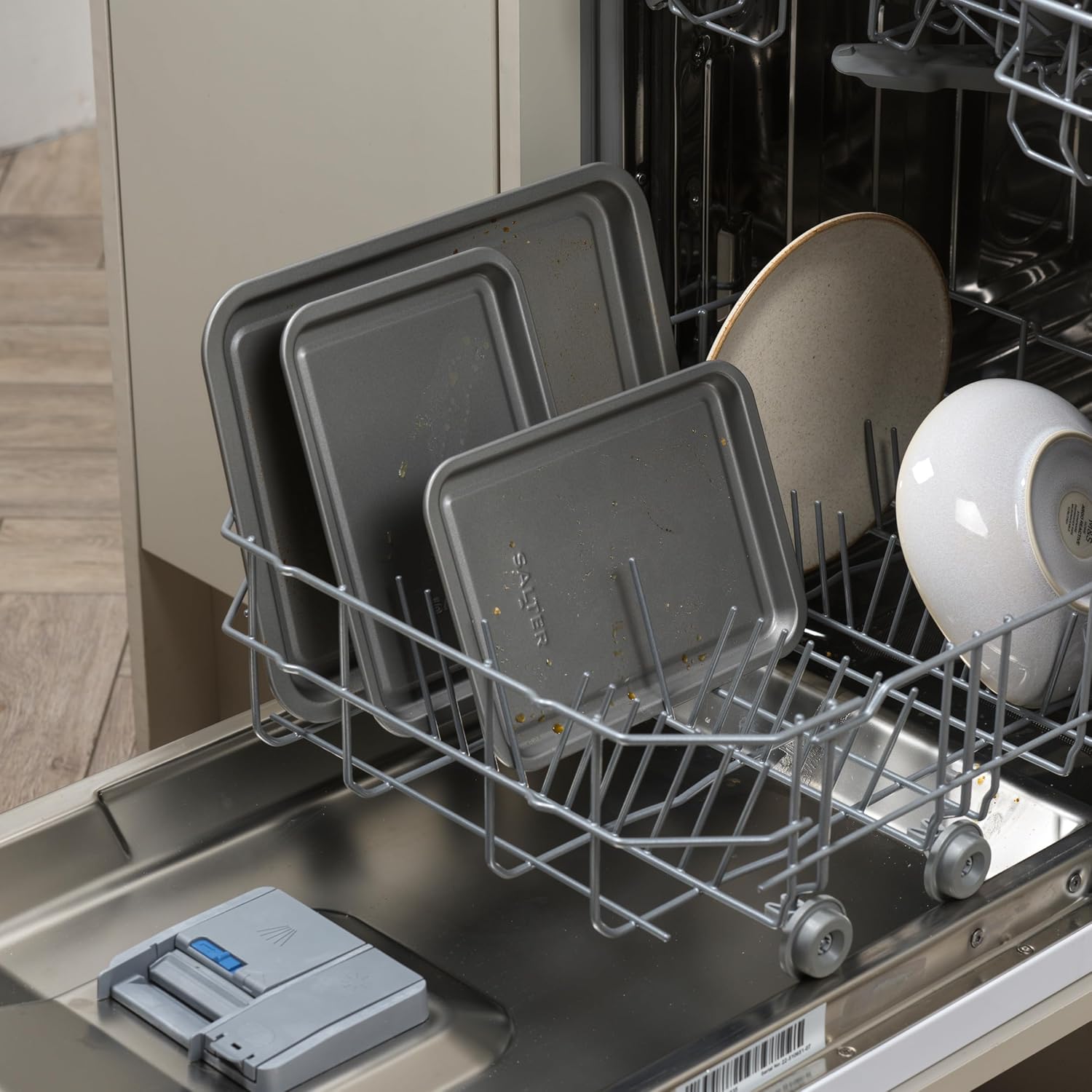 Crafted in the UK, this Salter Essentials 3-piece baking tray set is your go-to for perfect bakes every time. Perfect for making fresh snacks and sides, these oven sheets boast a durable carbon steel construction, offering exceptional heat distribution and longevity. Thanks to the non-stick coating, the trays ensure effortless food release and are easy to clean