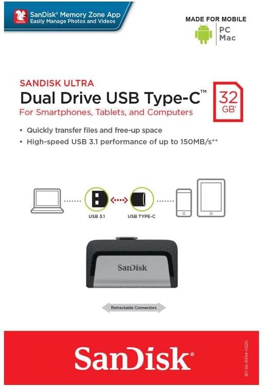 Easily free up space on your smartphone or quickly transfer files between devices at USB 3.1 High speeds of up to 150MB/s. With a reversible USB Type-C connector and a traditional USB connector, the Sandisk Ultra dual drive USB Type-C lets you quickly and easily transfer files between smartphones, tablets and computers. Plus the Sandisk memory zone app for Android helps you manage your device's memory and your content. The Sandisk Ultra dual drive USB Type-C is the perfect liaison between your USB Type-C device and your devices with traditional USB ports.