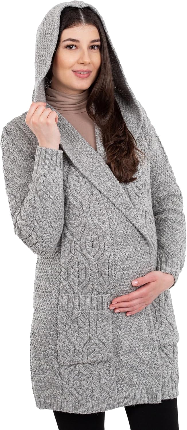 Indulge in luxurious comfort with our ladies' pregnancy cardigan! This Aran cardigan is meticulously crafted from 100% merino wool, renowned for its natural breathability and moisture-wicking properties. This exquisite material ensures optimal comfort without overheating, perfect for pregnancy's fluctuating temperatures. With intricate Aran cable and moss stitches, symbolizing safety, good fortune, and prosperity, this cardigan is a timeless piece steeped in tradition. Its thigh-length design, complete with a generous hood and deep pockets, seamlessly blends practicality with style, offering warmth and convenience wherever you go. Whether running errands or cozying up at home, this versatile Irish cardigan is an essential companion throughout pregnancy and beyond. Give this gift of warmth and love to an expecting mother, a timeless piece she'll adore for years to come.