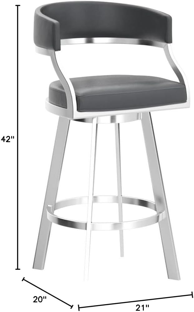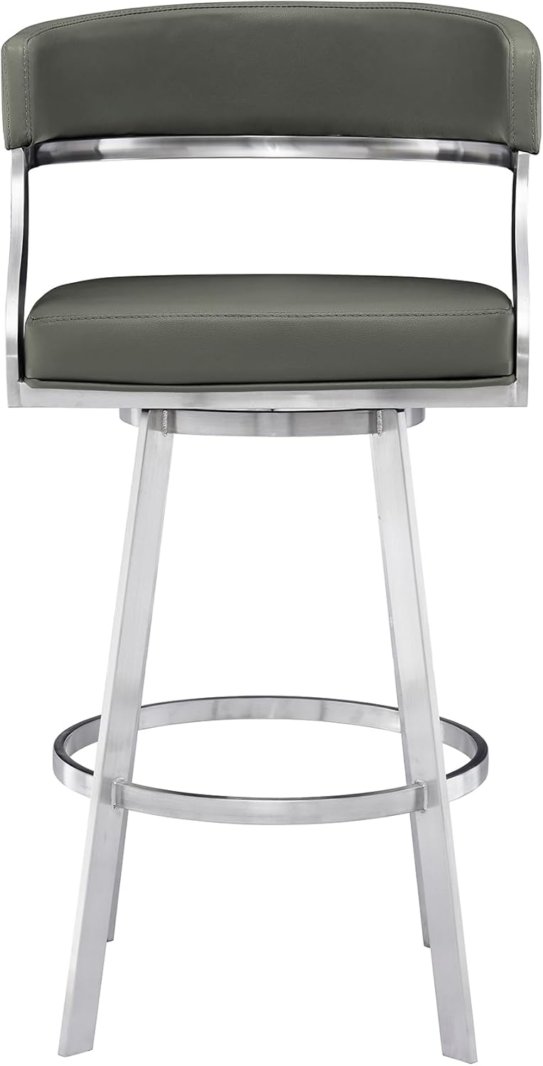 The Saturn 30" Bar Height Swivel Grey Faux Leather and Brushed Stainless Steel Bar Stool from Armen Living is a unique addition to any home or apartment. The Saturn’s soft faux leather upholstery is wrapped around a high-density cushion that cover the back and seat of the kitchen stool, providing you with optimal comfort. The 360-degree swivel motion allows your guests to stay engaged at parties or gatherings regardless of their place in the room, making this the perfect stool for entertaining! The Saturn is ideal for any room in your house, such as your kitchen, office, home bar, or den due to the availability of 2 seat height options. The open seat back provides breathable seating and allows for easy movement around your home. The sturdy frame consists of a 4 leg-base that includes a ring footrest and floor protectors, ensuring the Saturn will not damage your floors, further accentuating its convenience. The Saturn Bar or Counter Stool is available in a brushed stainless-steel finish with grey or black faux leather, an auburn bay metal finish with brown faux leather, or a mineral metal finish with vintage black faux leather upholstery.