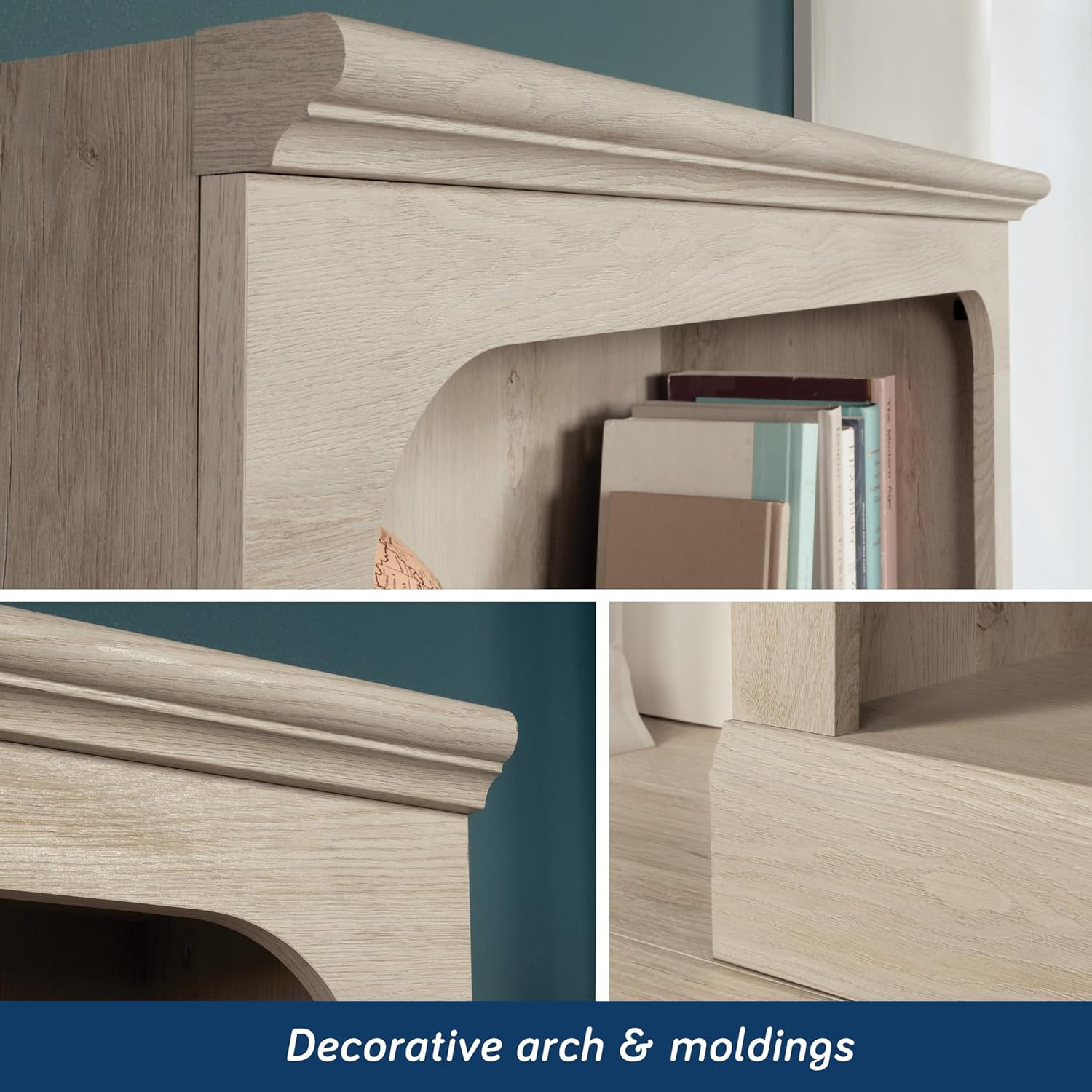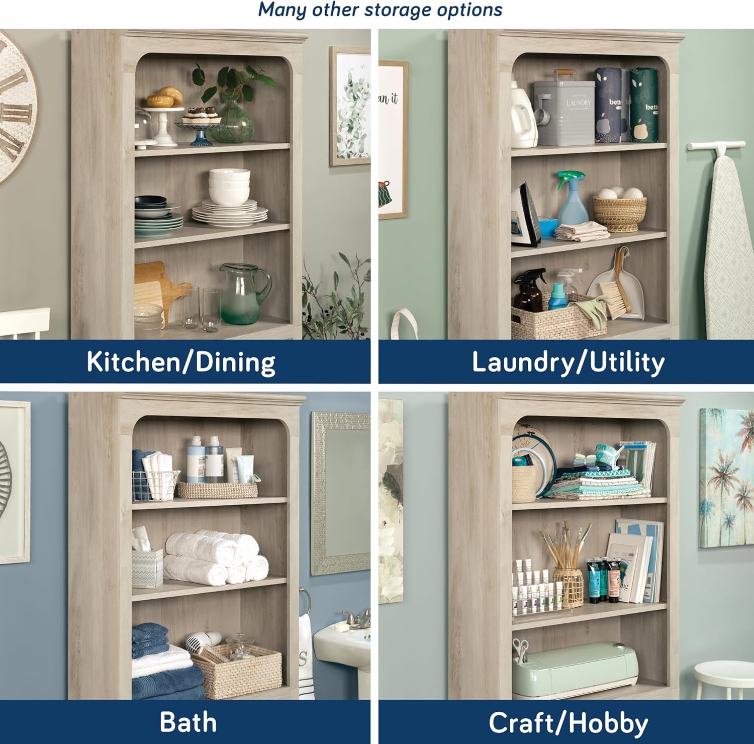 The classic transitional style and versatility of this 5-shelf bookcase from Sauder® is a must-have for any home. This display bookcase is designed to enhance any living space – from the home office to the family room, or the bedroom to the craft room. With a decorative arch and base molding, its sophisticated style is second only to its functionality. The three adjustable shelves of this engineered wood bookcase provide customizable storage of home office necessities, kitchen pantry items, craft supplies, bathroom necessities, and more. The enclosed back panel of this living room bookcase ensures stability and provides a tidy appearance. This 5-shelf bookshelf offers quick and easy assembly with slide-on moldings, for less hassle and more organization. Finished in the cool, woodgrain tones of Chalked Chestnut®, this trendy bookcase provides ample storage space and makes a big impact on interior style.