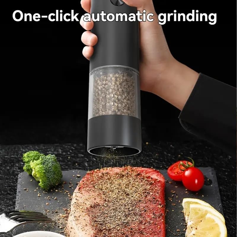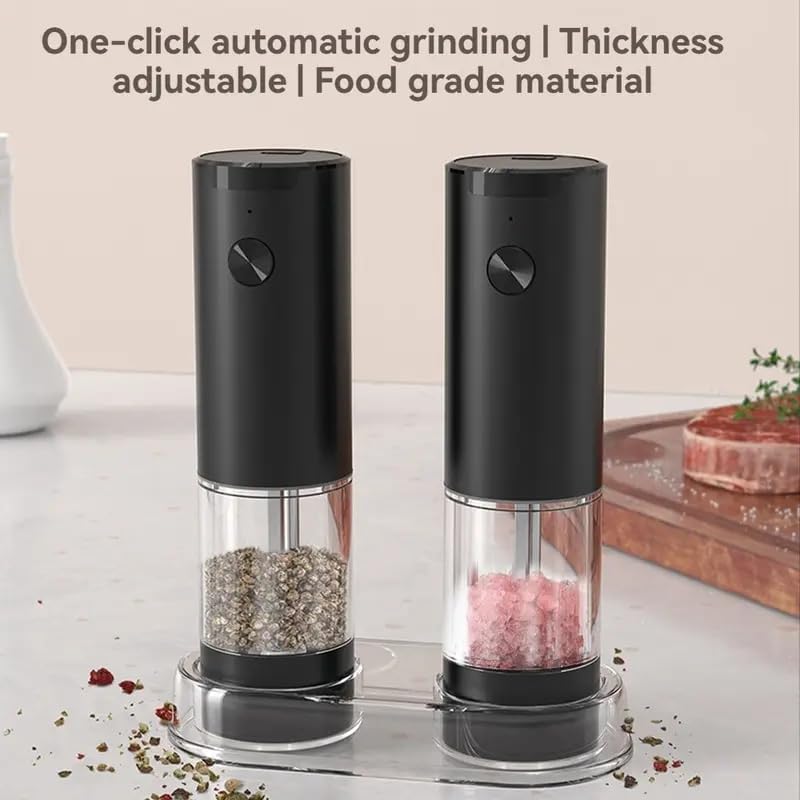 Elevate your kitchen experience with SeasonMate, the sleek stainless steel electric grinder set designed for effortless seasoning. Each package includes two grinders and a matching storage base for neat organization and easy access. With five adjustable coarseness levels, you can dial in the perfect grind for any recipe. One-button operation, powered by 4 AAA batteries (not included), makes seasoning as simple as pressing and releasing—no twisting required, and effortless to use with just one hand. The built-in LED light ensures precise seasoning even in dim settings, while durable ceramic blades resist wear and deliver consistent performance. The 360° transparent container holds more salt or pepper with fewer refills and can be removed for easy rinsing. The grinding head detaches for quick brush cleaning, keeping everything fresh and ready. Lightweight, portable, and finished in modern stainless steel, SeasonMate is perfect for home kitchens, dinner parties, barbecues, or camping. Convenient, reliable, and stylish—your new go-to seasoning companion.